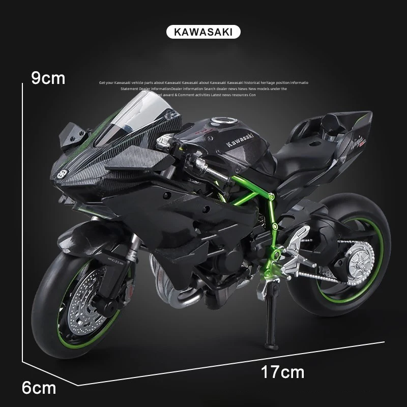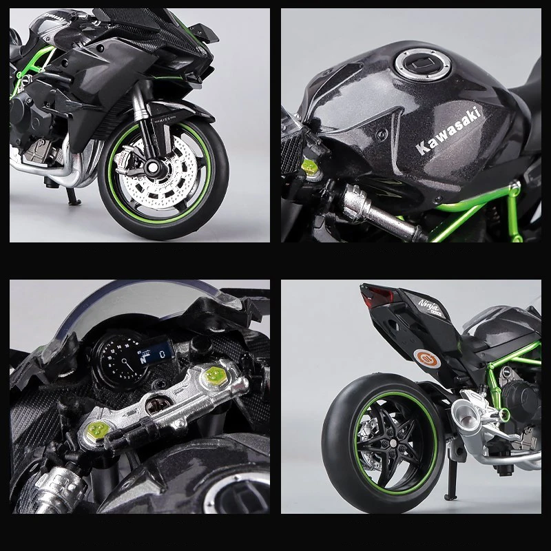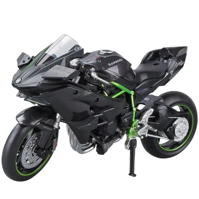 Immerse yourself in the high-performance world of the Kawasaki H2R Ninja with this meticulously crafted die-cast motorcycle model. Scaled at 1:12, it captures the aggressive, aerodynamic design, featuring a matte black body accented by neon green highlights on the frame and wheels. The angular fairings, clear windscreen, and detailed mechanical components like vents, textured surfaces resembling carbon fiber, and realistic exhaust piping make it an impressive display piece or collectible toy. Made from alloy and plastic, this model combines durability with intricate finish touches that mimic the real bike’s sporty look. Perfect for enthusiasts, this collectible stands out on any shelf, bringing the thrill of Kawasaki’s iconic superbike into your collection.