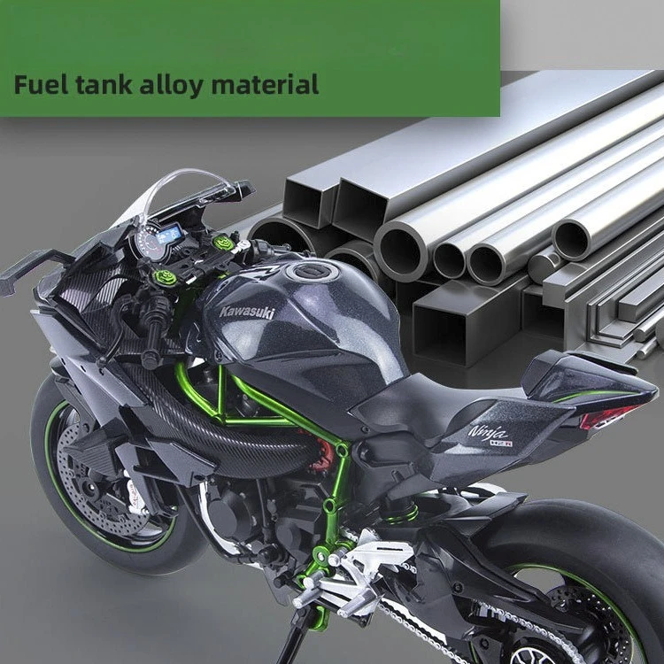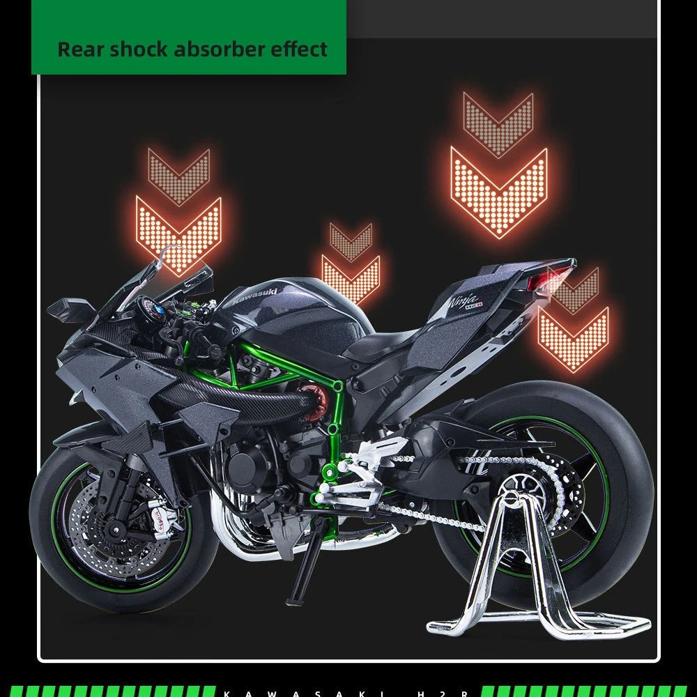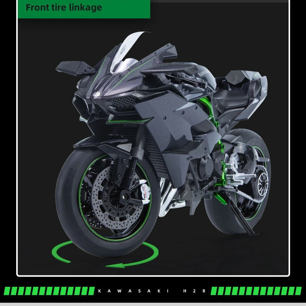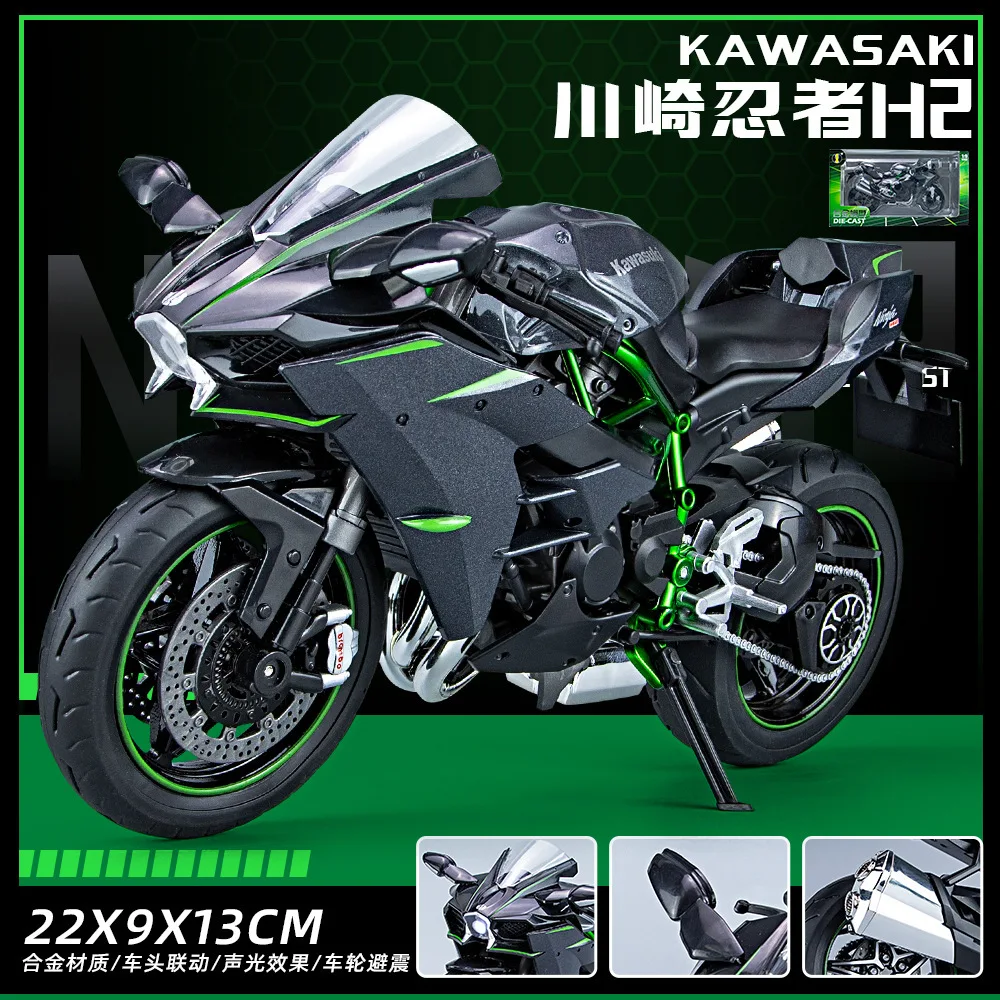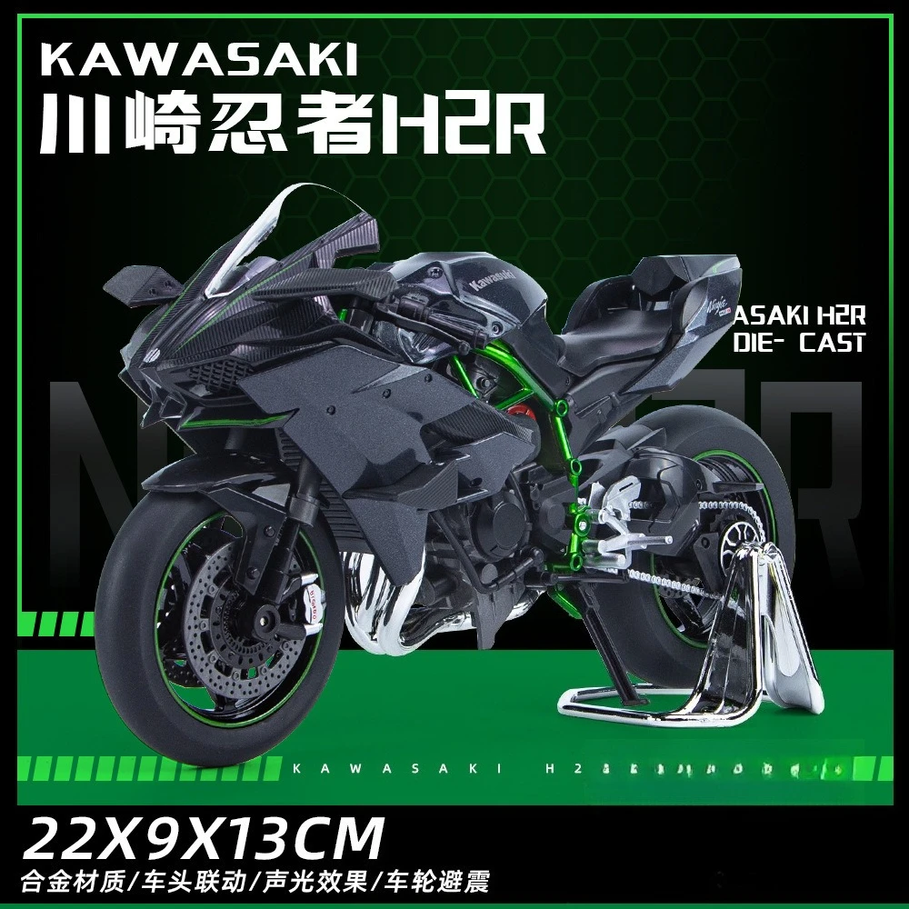 The 1:9 Kawasaki Ninja H2R diecast model is crafted from durable metal and features intricate details, including a sleek black finish with striking green accents. This stunning model showcases textured bodywork that mimics carbon fiber, a transparent windscreen, and integrated headlights for an authentic racing aesthetic. Its large, detailed wheels exhibit a realistic tire tread pattern, while metallic accents such as the exhaust pipes and stand enhance its sophisticated appearance. Equipped with racing sound and light functionalities powered by a button battery, this model offers an interactive experience—an ideal collectible or gift for enthusiasts. Available options include ‘H2 no box’, ‘H2R no box’, ‘H2 with box’, and ‘H2R with box’.