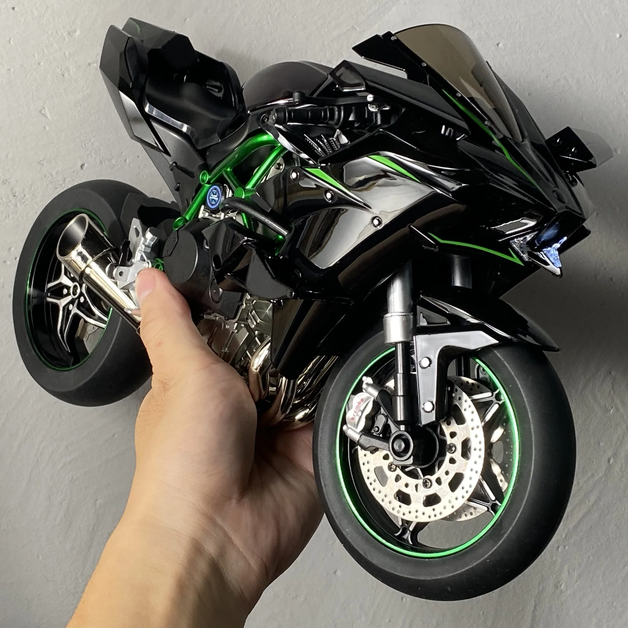 Experience the thrill of motor racing with this exquisite 1:6 scale diecast model of the Kawasaki Racing Ninja 500 H2R motorcycle. Designed with a glossy black finish and vibrant green accents, this model stands out as a true collector's piece. Each detail, from the sharp angular headlights to the intricate exhaust and front fairing, exemplifies stunning craftsmanship. The robust wheels with detailed rims and brake discs not only enhance its sporty aesthetic but also provide realistic attributes. Supported elegantly by striking red display stands, this collectible is crafted primarily from metal, ensuring a substantial feel perfect for any display or collection.
