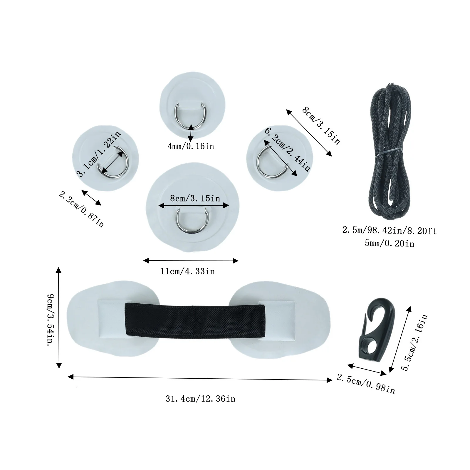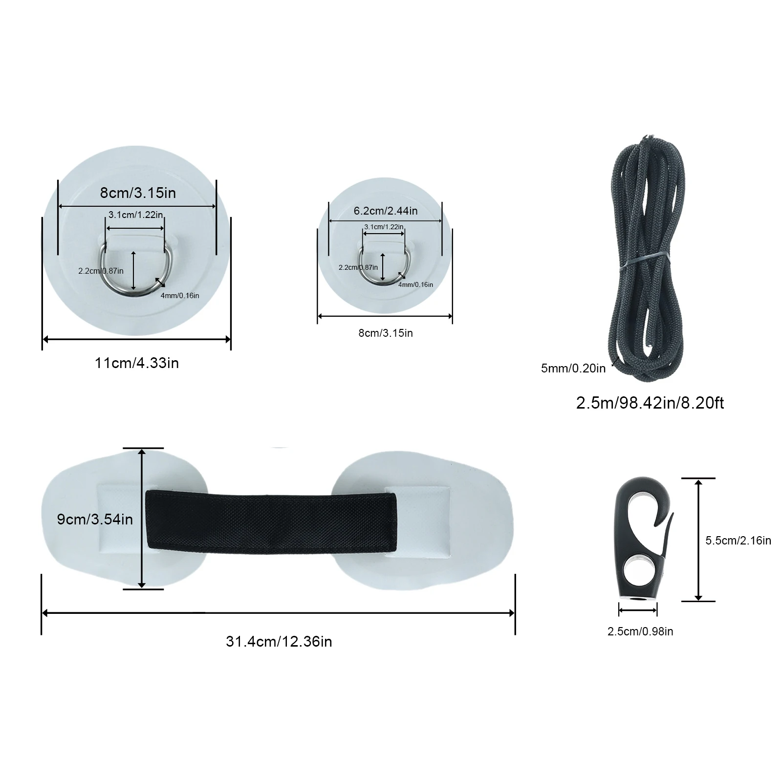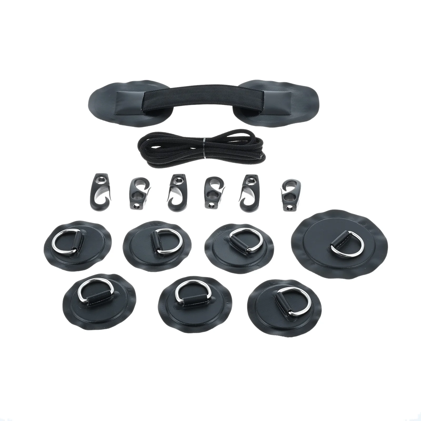 - Includes six small PVC D-ring patches (3.15″) with stainless steel rings for secure attachment points on your kayak or boat.