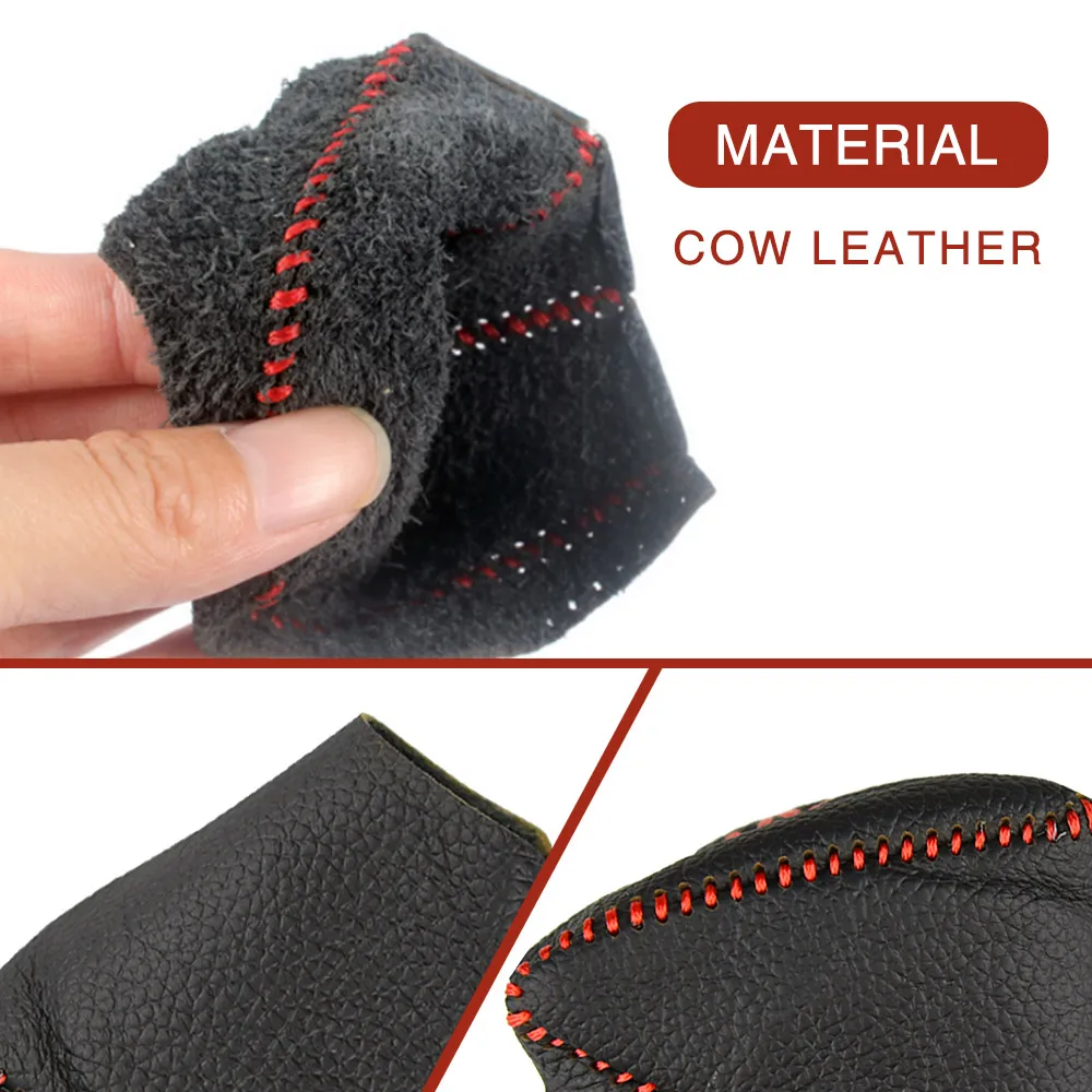 Imagine elevating your driving experience with this premium cow leather gear shift knob cover. Crafted from genuine cow leather, it exhibits a textured, slightly pebbled surface that radiates elegance and durability. Available in classic black or vibrant red, the cover features contrasting stitching along the seams, adding a sporty flair suited for your stylish Kia. Its snug fit over the automatic gear shift head ensures a seamless, refined look. The metallic top of the gear shift knob peeks through, providing a glossy contrast against the soft leather. Perfectly tailored for selected Kia models, this cover offers both protection and a personalized touch to your interior, making every drive feel luxurious and unique.