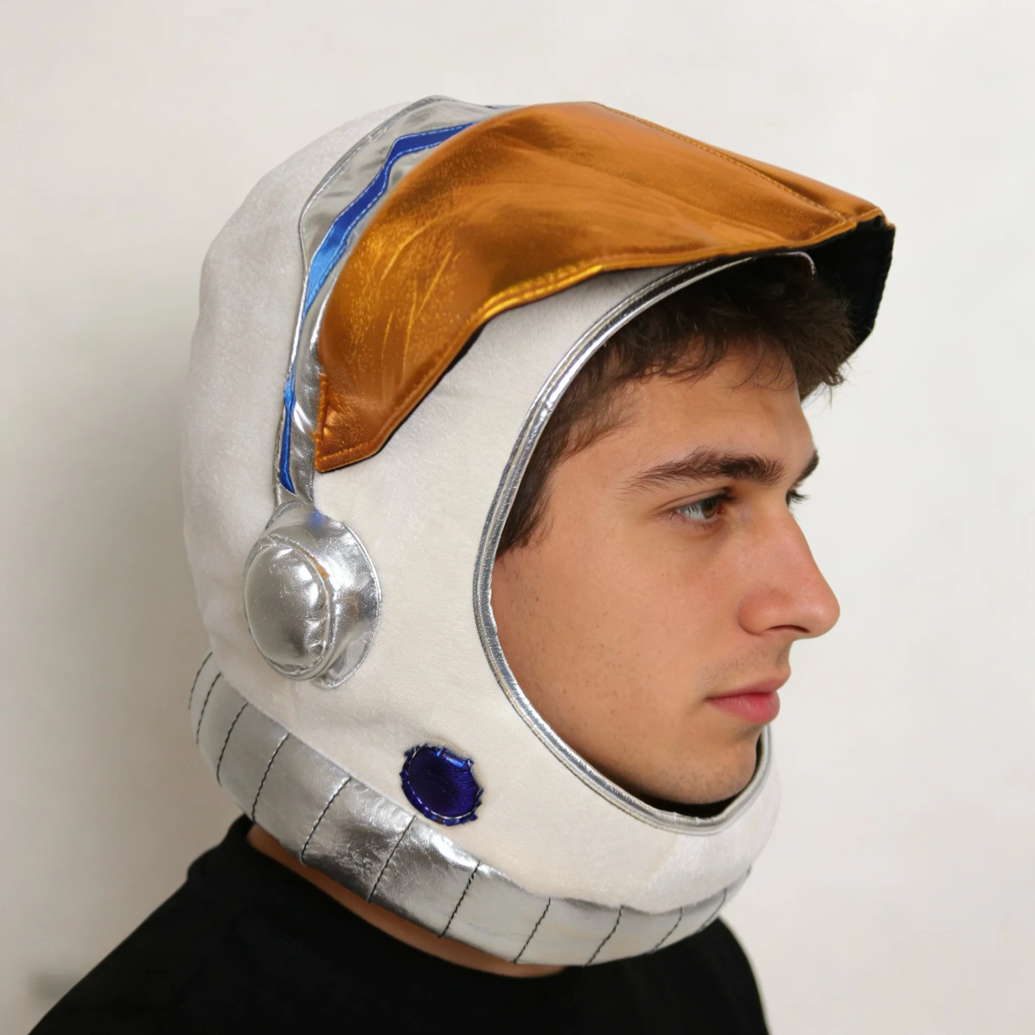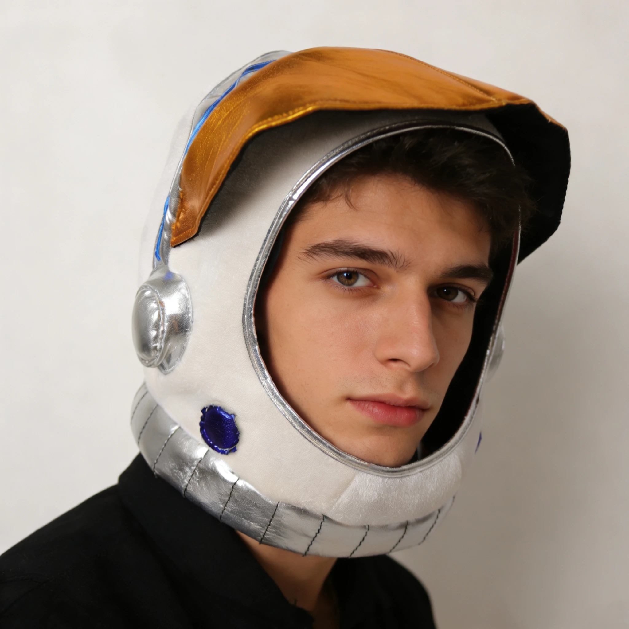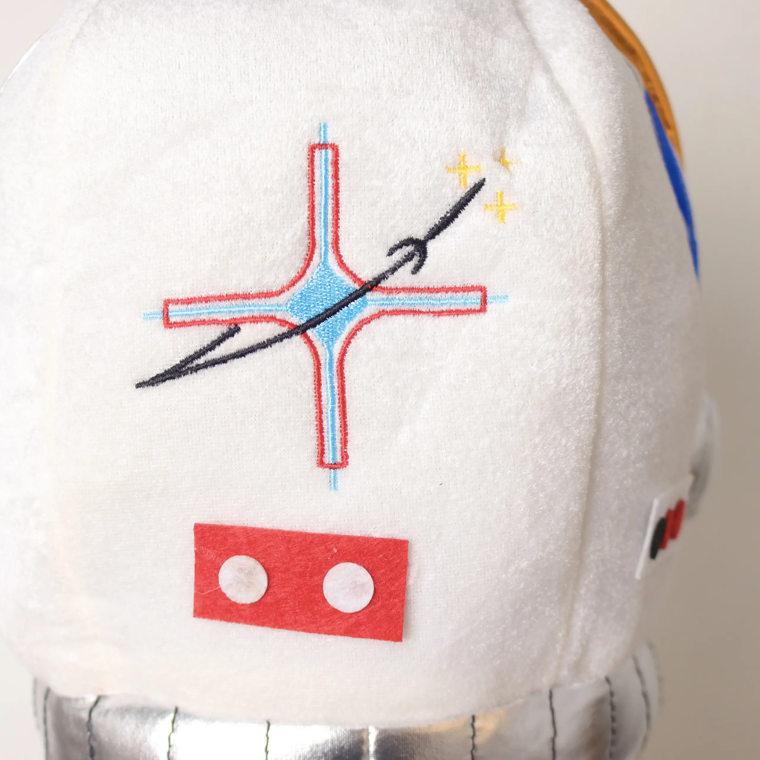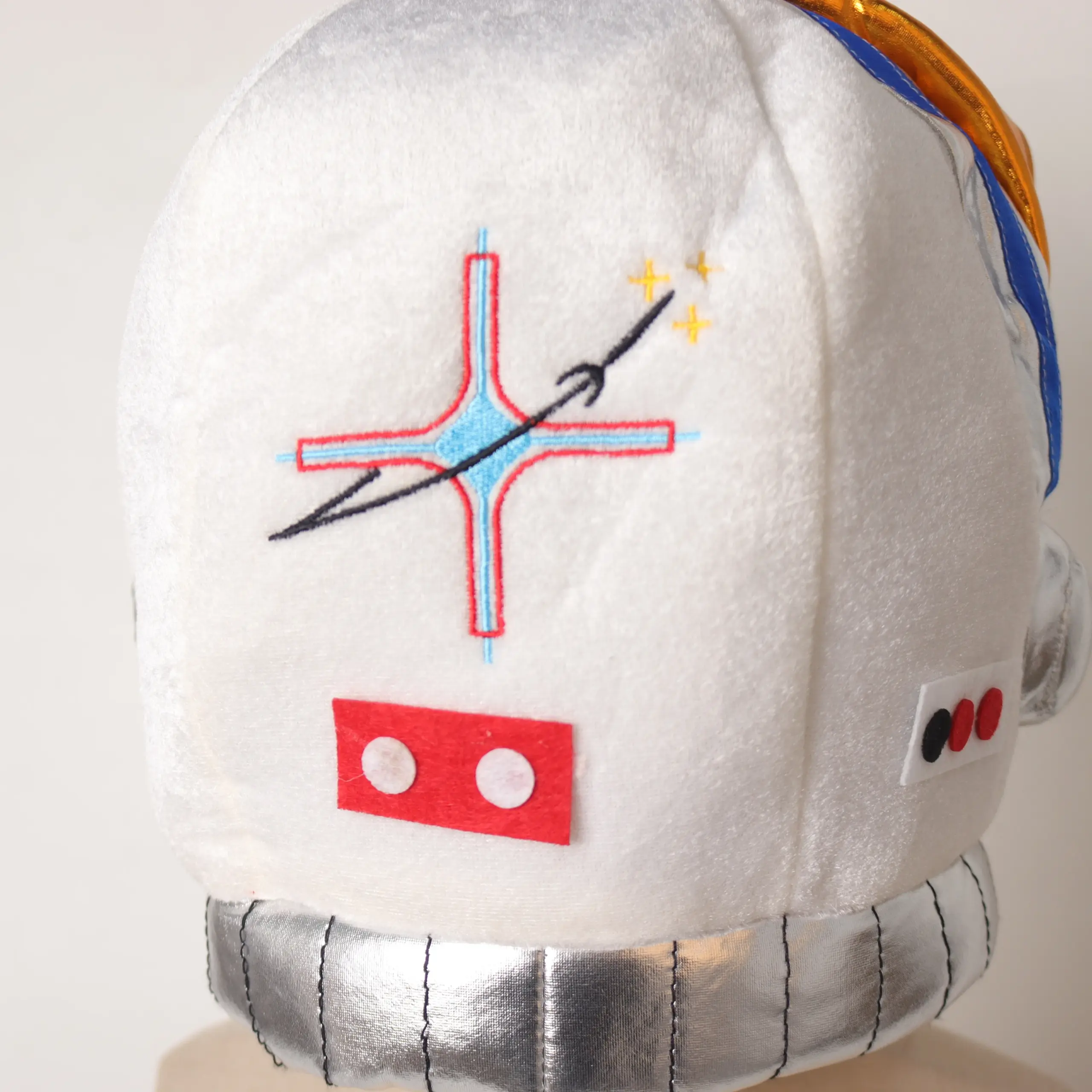 Step into an imaginative universe with this adorable kids' space plush helmet costume. Crafted from soft, textured white cloth fabric, this helmet offers comfort and a fun, realistic astronaut look for children. Its vibrant design features a prominent blue stripe running vertically, silver metallic accents mimicking real space helmet components, and embroidered red, black, and blue details that enhance its playful appeal. The padded, plush material provides a cozy feel, making it perfect for playtime or costume parties. Its snug fit ensures safety and comfort while allowing kids to explore their space adventures freely. Let your child's imagination soar as they don this charming helmet, transforming them into a young astronaut ready for stellar explorations right at home or on the go.
