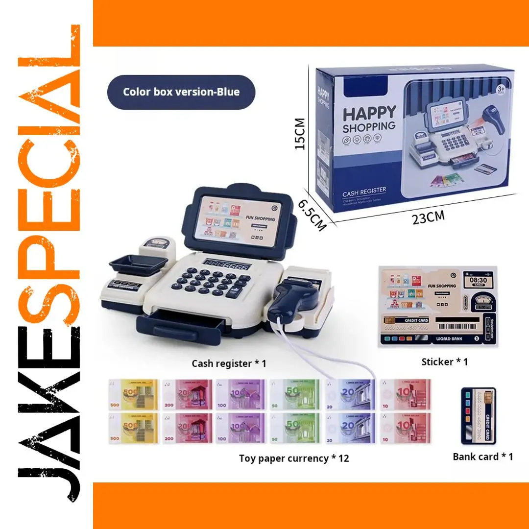Imagine the joy on your child's face as they engage in pretend shopping with this colorful, lifelike supermarket cash register. Crafted from eco-friendly, non-toxic ABS plastic, it offers a safe and durable play experience. The main unit features a bright white body with vibrant dark blue accents, including a handle and side components that create an inviting, modern aesthetic. The digital display screen is lively, showing colorful icons that capture attention and enhance interactive play. The keypad has black buttons neatly arranged for easy operation. Accessories like a dark blue barcode scanner with a white cord, a grey credit card reader, and multi-colored currency notes add to the realism. Your child can learn basic math, money recognition, and social skills through imaginative shopping adventures that foster both fun and education.