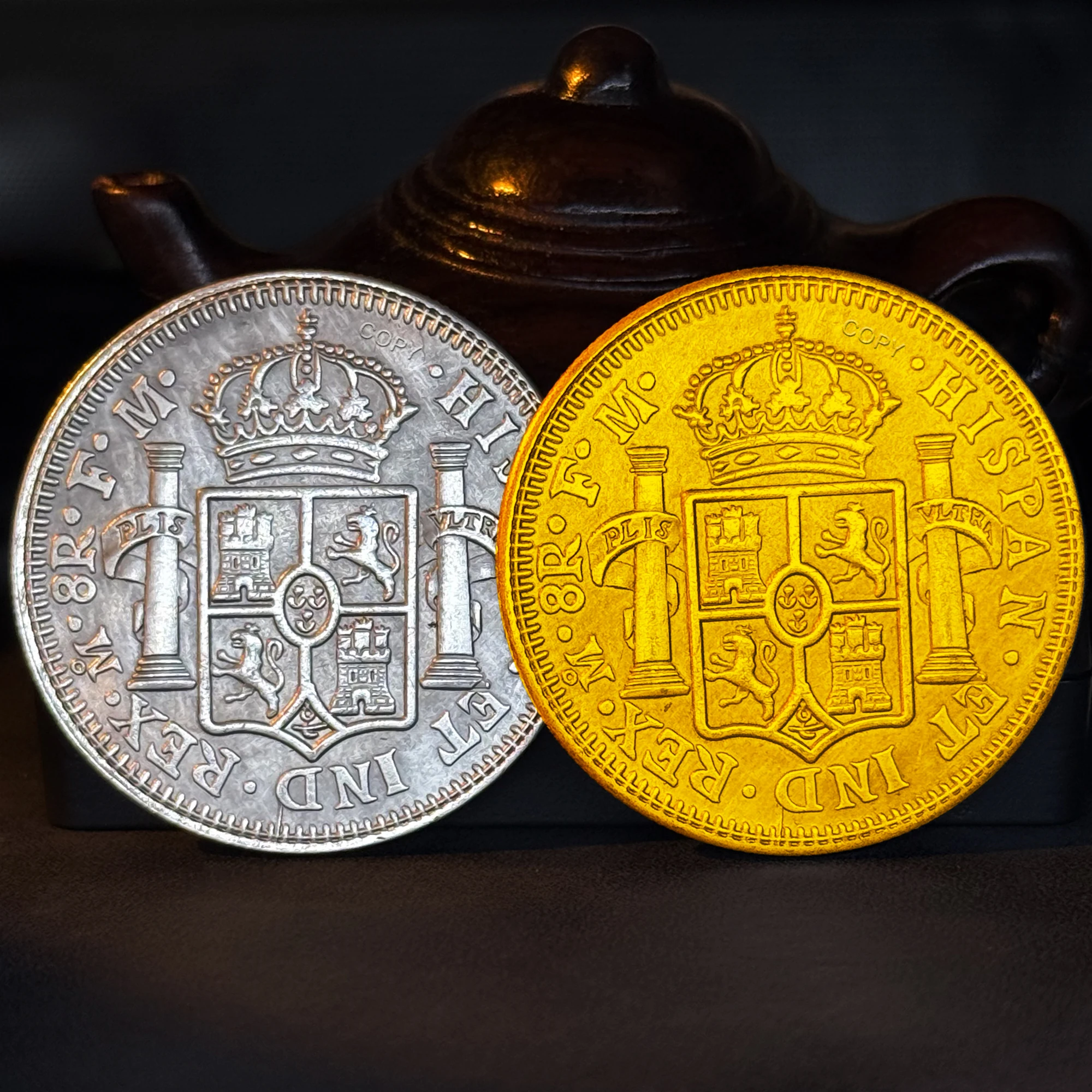 Experience a touch of European history with this exquisite replica coin measuring 38mm in diameter. Crafted from durable copper, it features meticulously detailed relief engravings of King Fernando VII facing right, adorned with wavy hair, a laurel wreath, and ornate clothing. The coin’s textured, ridged rim adds an authentic vintage charm, while its dual finishes — antique silver and polished gold — highlight the craftsmanship of each piece. The polished metallic shine emphasizes intricate carvings and inscriptions, including “FERDINAND VII” and “1813,” transporting you to a historic era. Whether used as a decorative accent, collectible souvenir, or meaningful gift, this coin captures elegance, heritage, and craftsmanship in every detail, making it a superb addition to any collection or display.