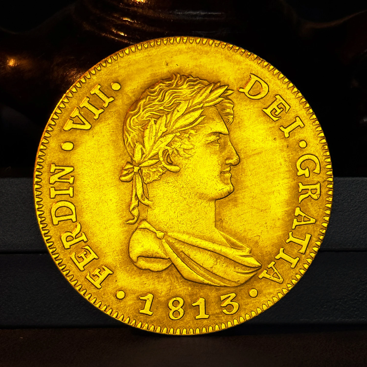 - Features fine detailed inscriptions such as “FERDINAND VII. DEI GRAT” and the year 1813, along with a historic European double pillar motif, encapsulating the period’s elegant artistic style.