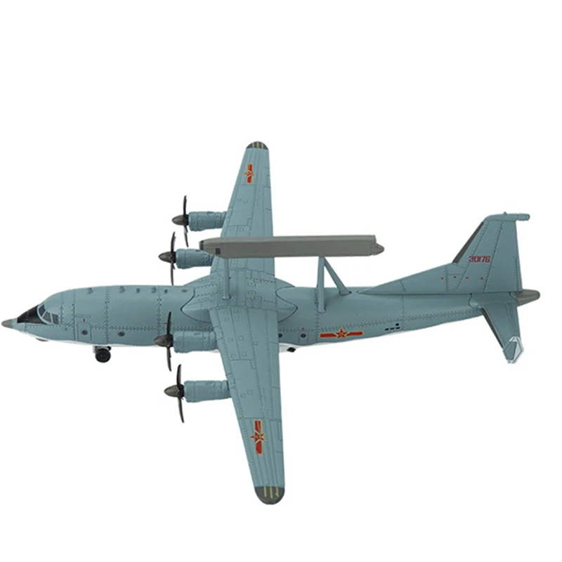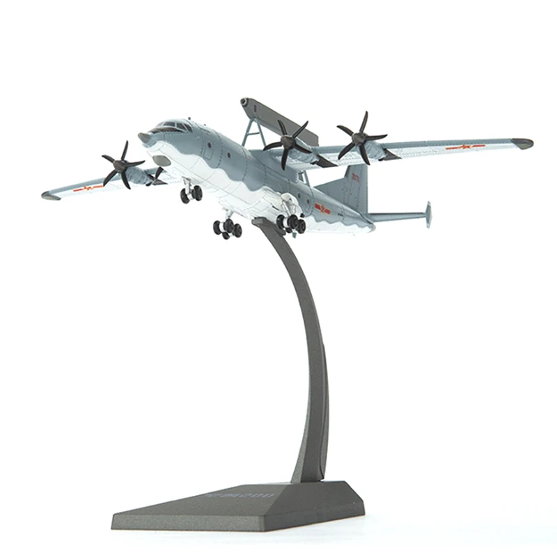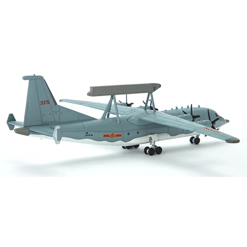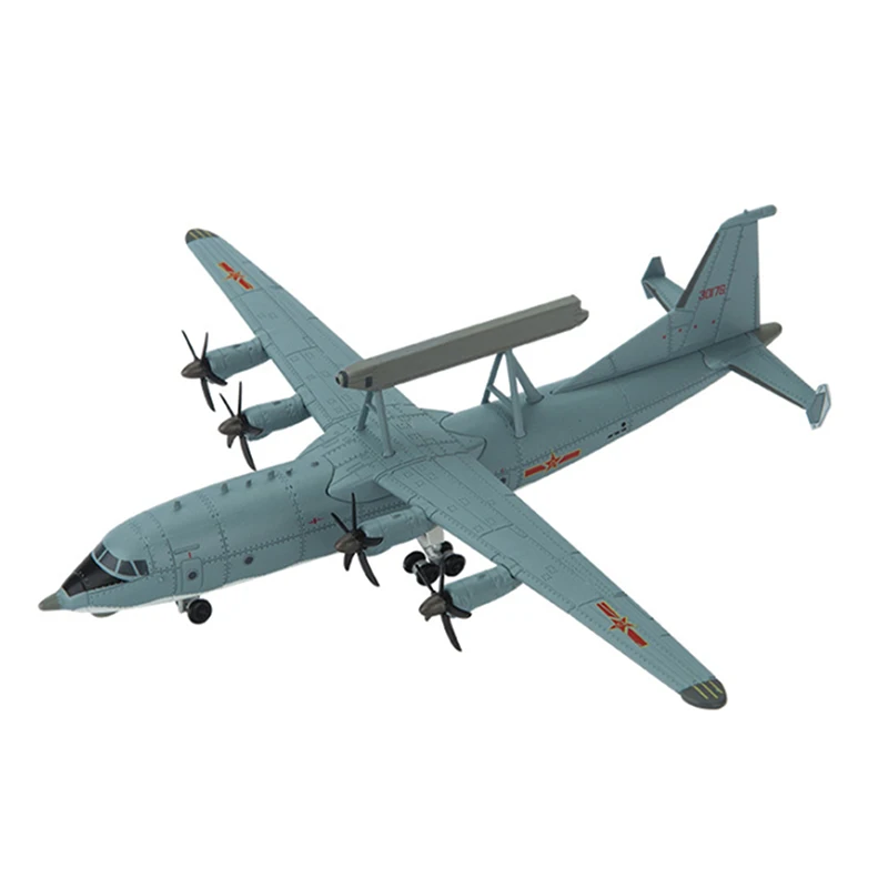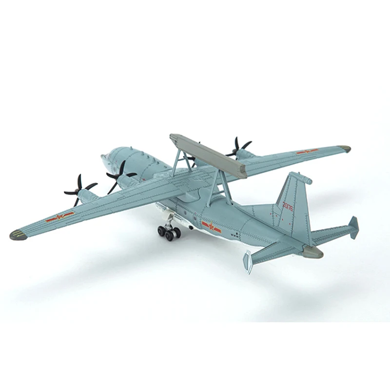 Experience the impeccable craftsmanship of this meticulously crafted 1:200 scale KJ-200 early warning reconnaissance aircraft model. Made from high-quality alloy, this static display piece showcases a sleek, aerodynamic fuselage painted in a refined light grayish-blue hue, highlighting a modern military aesthetic. The polished surface reflects light beautifully, emphasizing the detailed panel lines and precise construction. Its broad, straight wings feature subtle engraved details, while small black-propeller nacelles add realism. The tail fin and horizontal stabilizers are sharp and proportionate, with striking red markings for visual contrast. The model features a prominent radar detection pod above the fuselage, emphasizing its technological design. Ideal for collectors or as a sophisticated decorative ornament, this model elevates any display space with its detailed and elegant appearance.