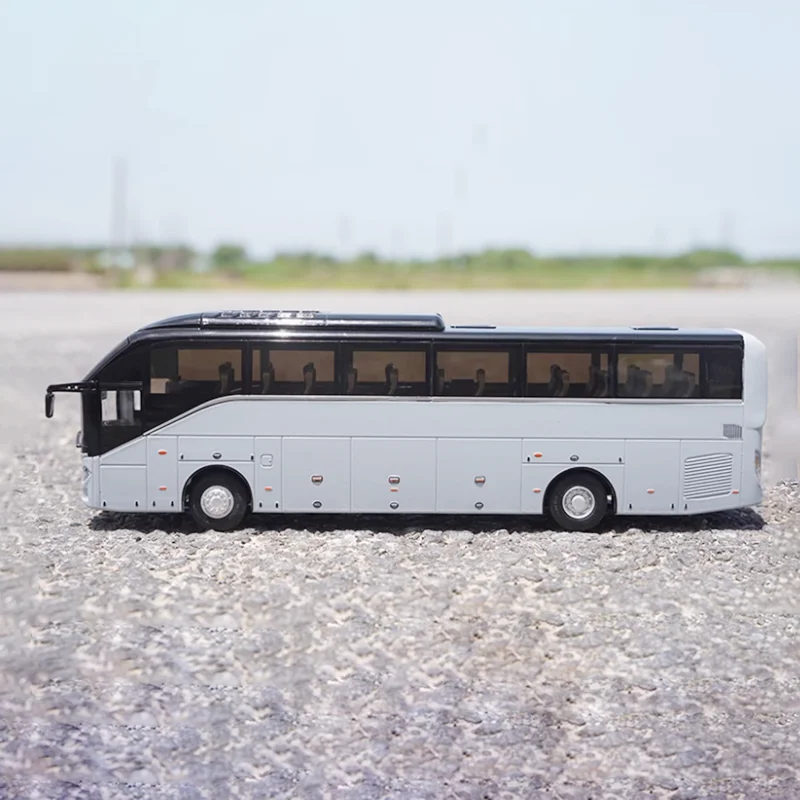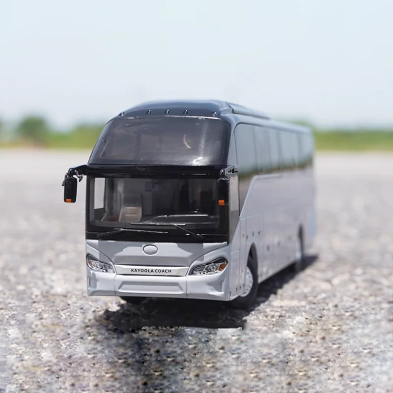 Experience the intricate craftsmanship of this diecast alloy model representing the modern KMC Kayoola Tour Bus. Measuring approximately 43 centimeters in length, 5.5 centimeters in width, and 8 centimeters in height, this highly realistic replica captures the sleek design and sophisticated aesthetic of a contemporary tour bus. The body features a luminous light grey tone, complemented by a glossy black roof and upper section that accentuate its stylish profile. The large, slightly curved windshield with black framing and tiny green indicator lights adds authentic detail and visual interest. Dark-tinted side windows stretch across the entire length, enhancing its streamlined appearance. Designed for collectors, this static display model showcases fine panel lines, detailed headlights, grille, side mirrors, and realistic wheels with hubcaps, making it an eye-catching addition to any collection.