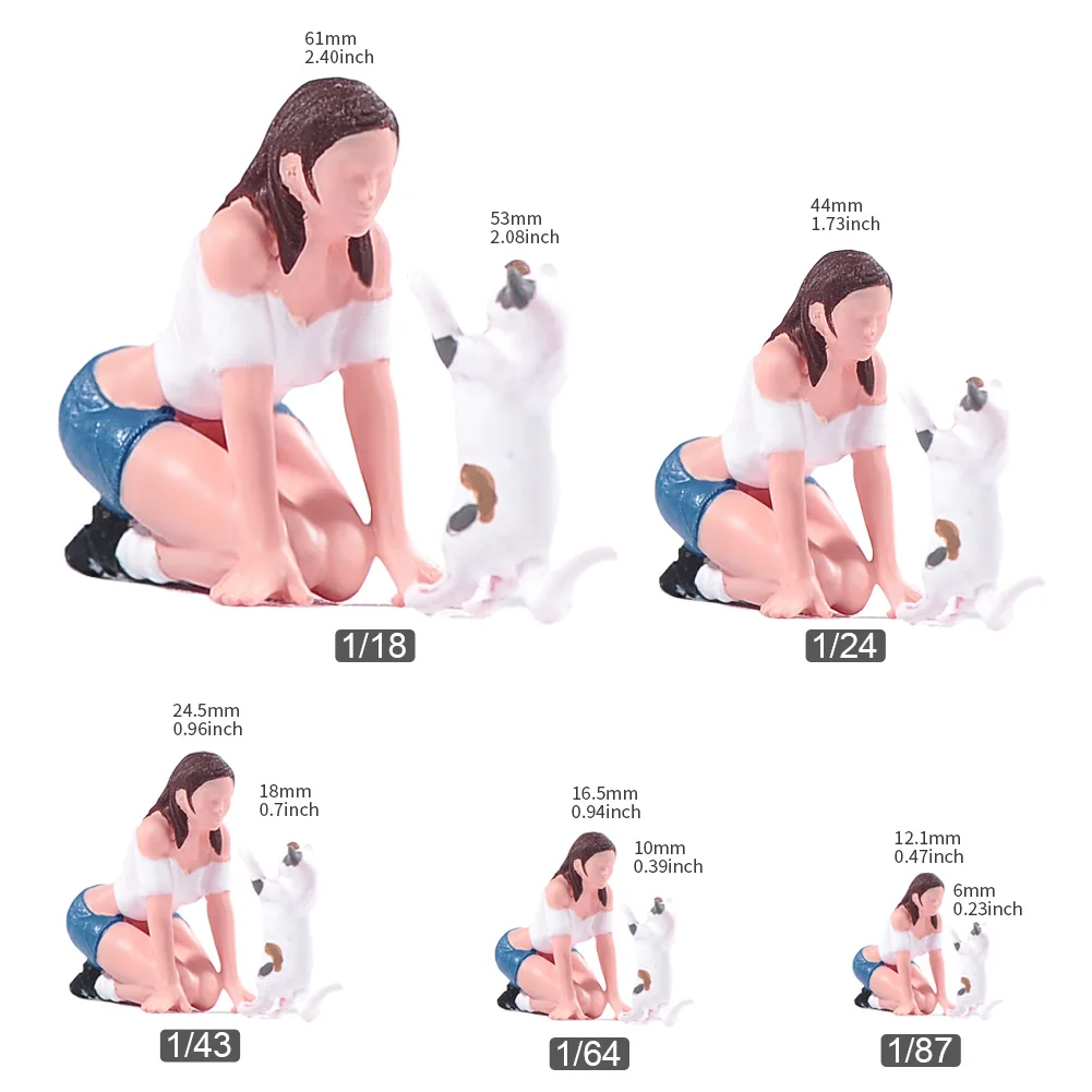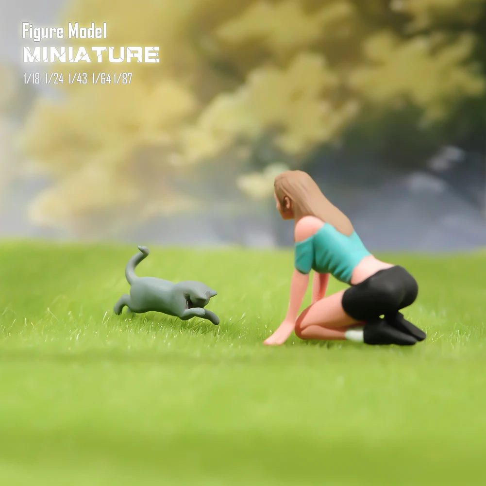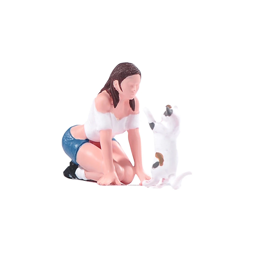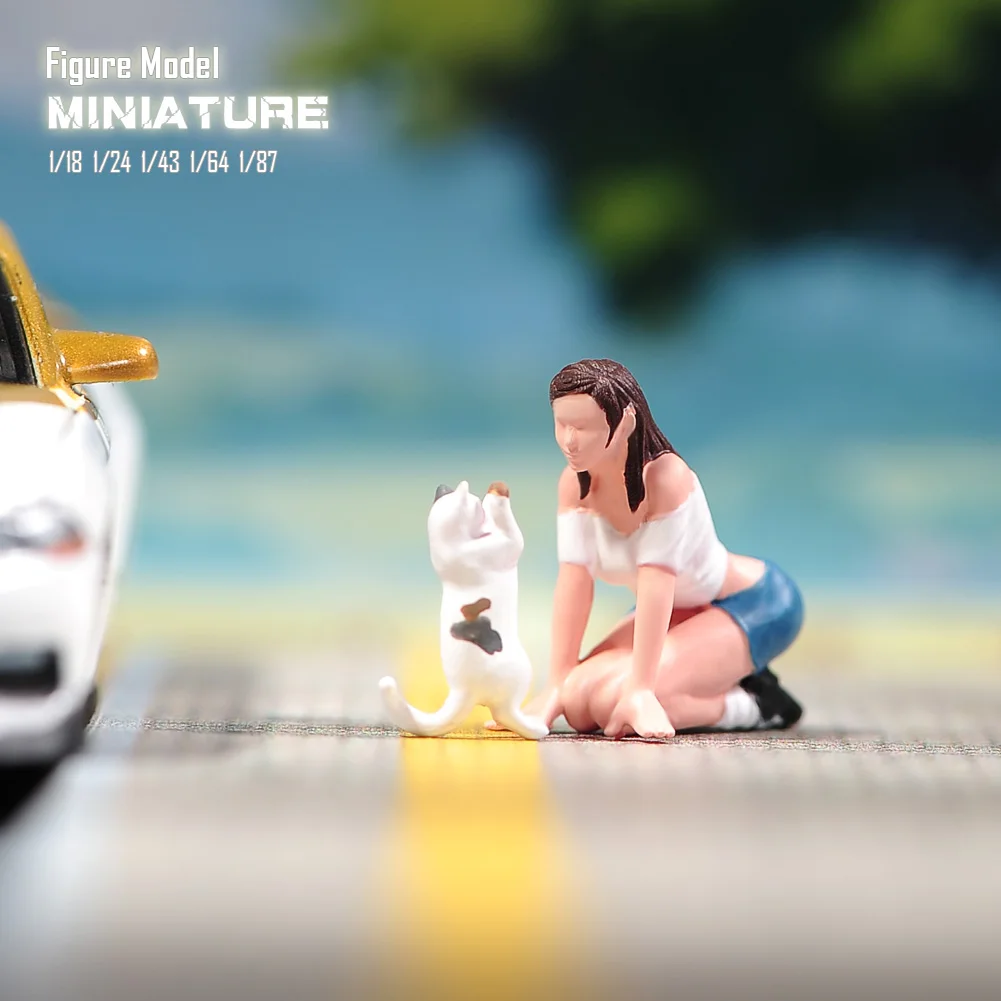 Imagine enhancing your collection with this stunning miniature model scene, featuring a kneeling girl and a playful cat. Carefully crafted from resin, this piece captures the charm of a relaxed, casual moment with intricate details and vibrant colors. The girl sports long, dark brown hair and is dressed in a form-fitting, cropped white off-shoulder top complemented by blue denim shorts. The white cat, marked with distinctive black features, adds a delightful touch, making this perfect for display or micro photography. This figure is a beautiful representation of artistry and attention to detail, designed for collectors who appreciate fine craftsmanship.
