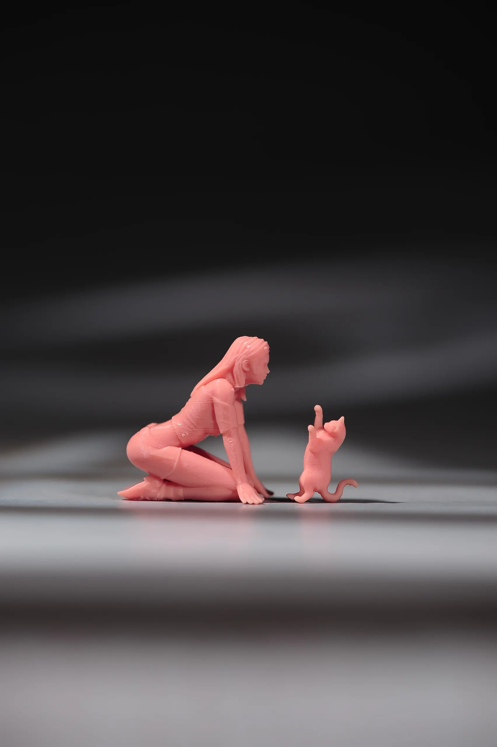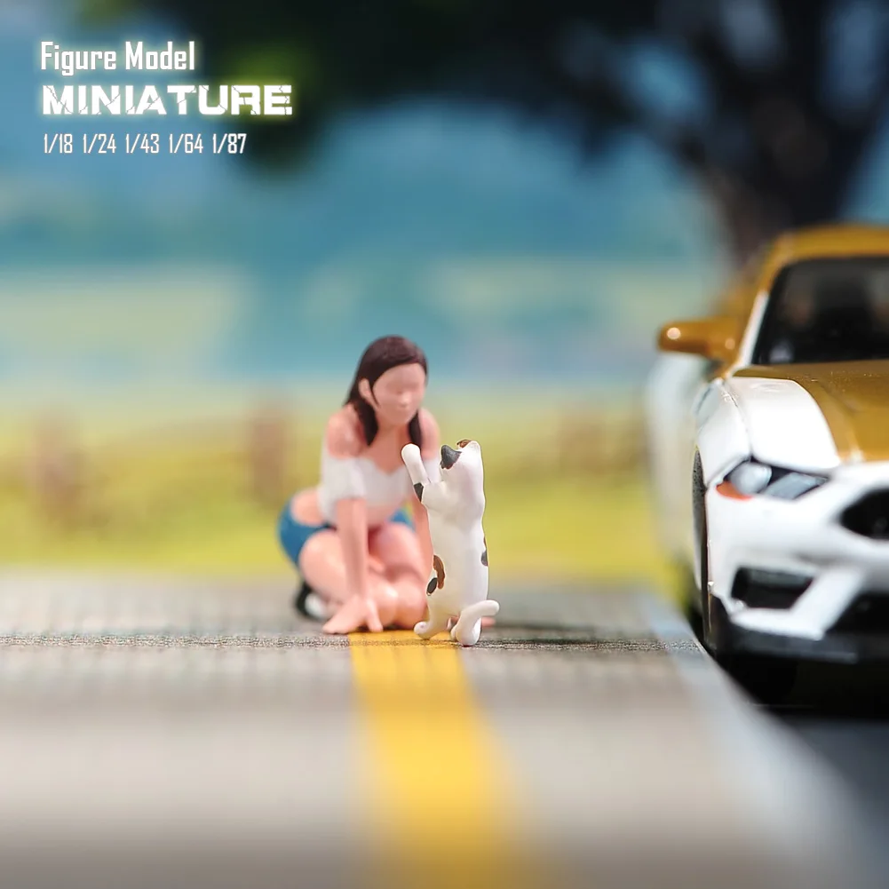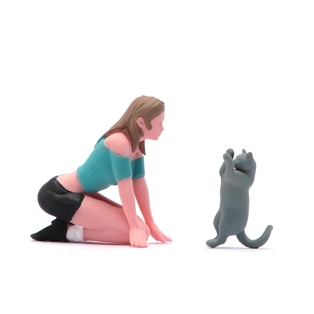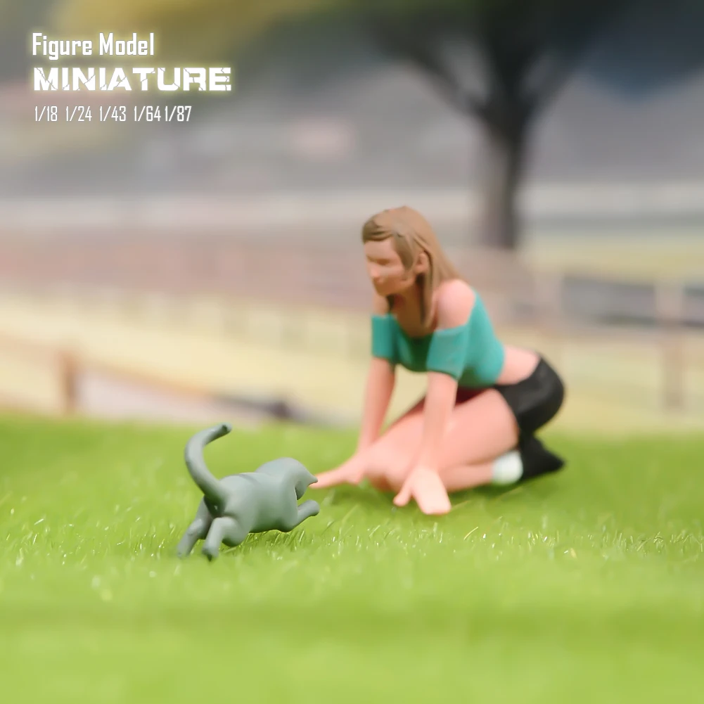 Imagine enhancing your collection with this stunning miniature model scene, featuring a kneeling girl and a playful cat. Carefully crafted from resin, this piece captures the charm of a relaxed, casual moment with intricate details and vibrant colors. The girl sports long, dark brown hair and is dressed in a form-fitting, cropped white off-shoulder top complemented by blue denim shorts. The white cat, marked with distinctive black features, adds a delightful touch, making this perfect for display or micro photography. This figure is a beautiful representation of artistry and attention to detail, designed for collectors who appreciate fine craftsmanship.