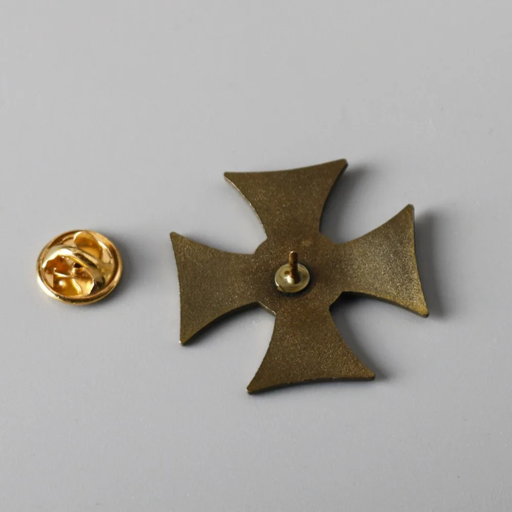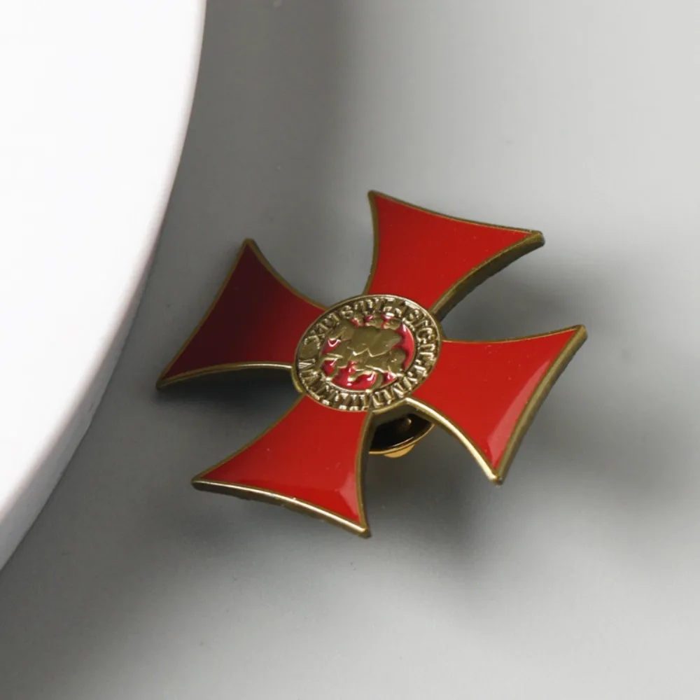 This Knights Templar Badge Metal Pin Brooch is a stunning accessory that showcases a vibrant red cross with a glossy finish, perfectly embodying both historical significance and artistic design. The symmetrical structure features four tapering arms that culminate in a striking shape, and at its center, intricate bronzed detailing enhances a circular emblem with relief figures. Ideal for personal expression, this unisex pin easily attaches to jackets, backpacks, or hats, making it the perfect addition to your wardrobe. Designed in a retro/military style, it caters to enthusiasts of the Knights Templar and similar themes. Its lightweight alloy construction ensures durability while remaining comfortable for everyday wear.