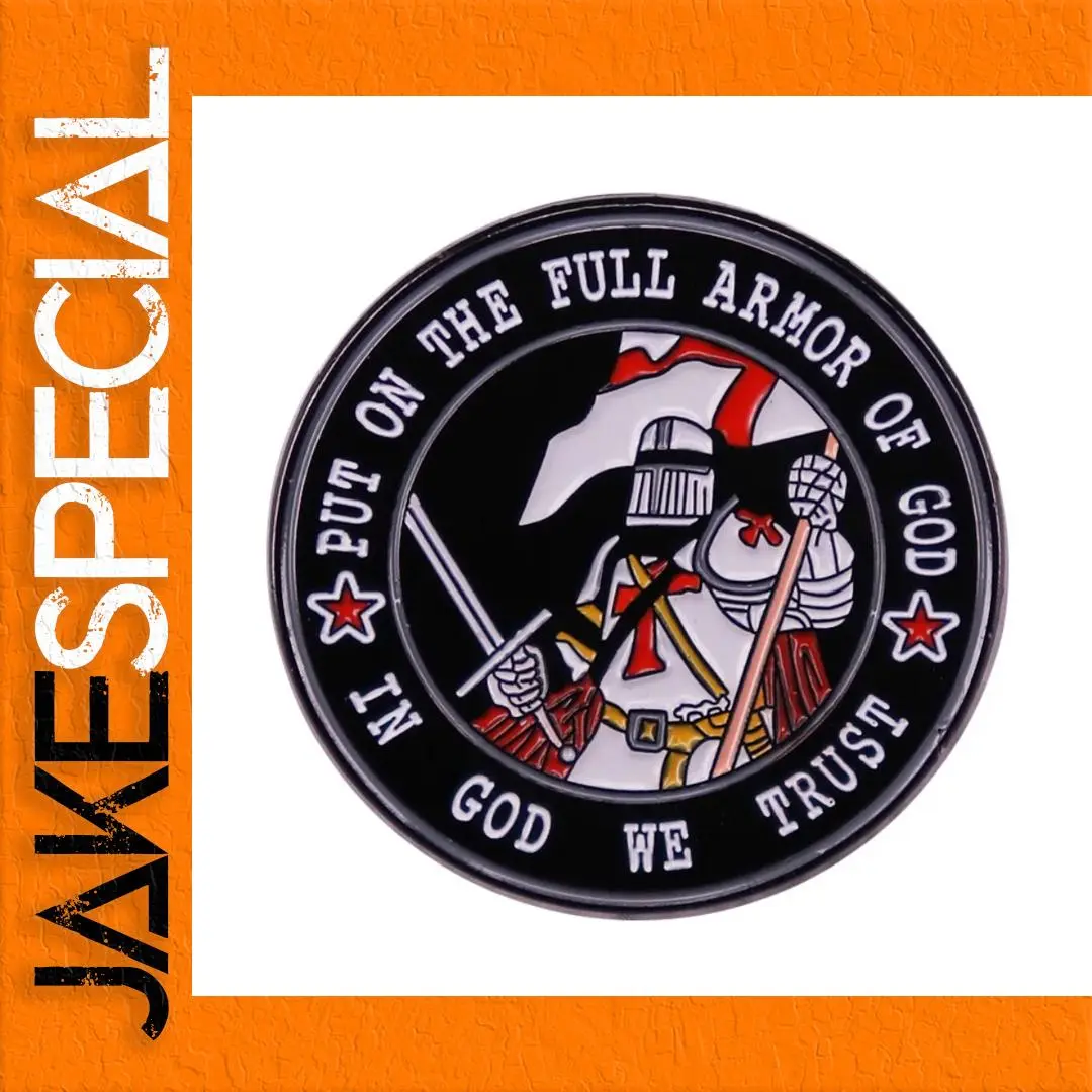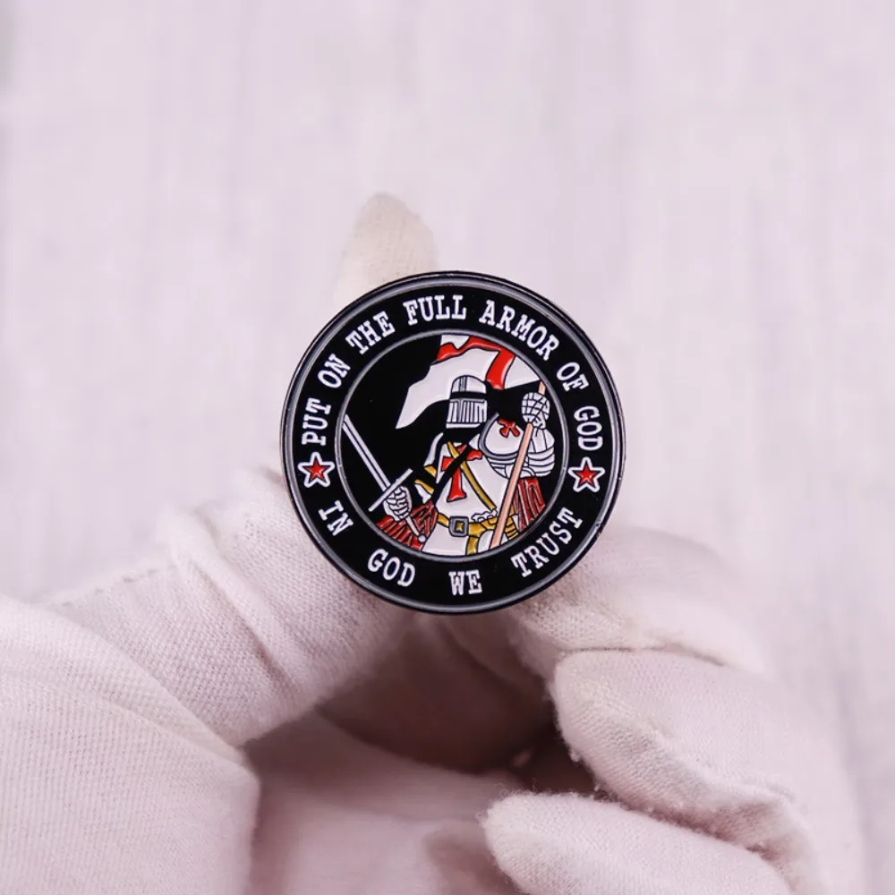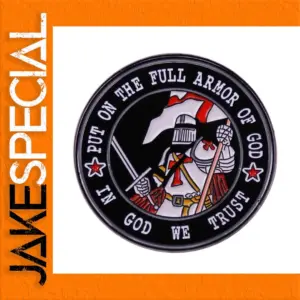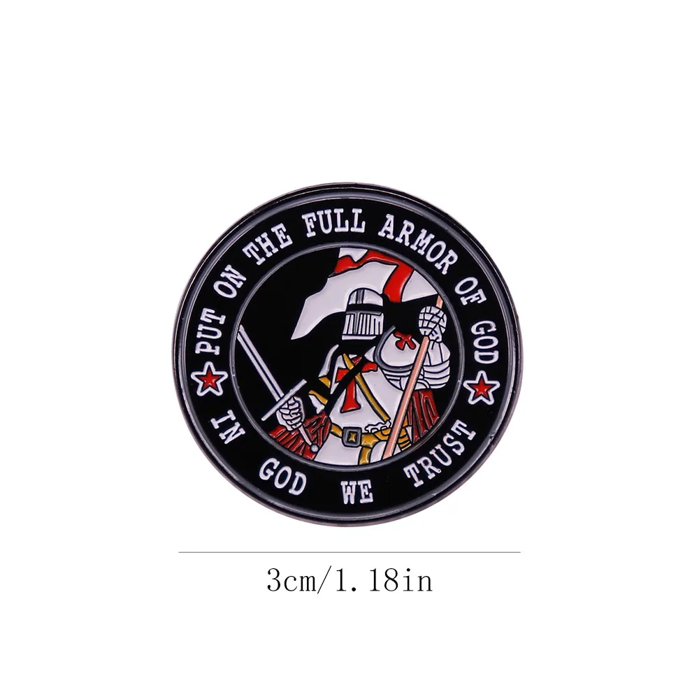 The “PUT ON THE FULL ARMOR OF GOD IN GOD WE TRUST” Knights Templar Crusader Round Lapel Pin is an eye-catching accessory crafted from durable metal alloy. This pin showcases a knight in full armor holding a sword and a flag adorned with a striking red cross, set against a black background that accentuates its vibrant colors. The inspirational phrases encircling the knight enhance its meaningful theme, while the decorative red stars add a stylish touch. Its retro design appeals to all genders, making it perfect for embellishing jackets, backpacks, hats, or for use in DIY clothing projects.