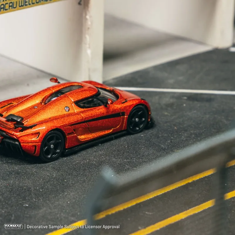 Experience the stunning realism of this highly detailed alloy model of the Koenigsegg Regera, part of the Tarmacs Works series. Measuring approximately 7 cm long at a 1:64 scale, it captures the sleek, aerodynamic design of the original with sharp contours and sporty accents. The vibrant, glossy red finish highlights the car's aggressive stance, complemented by black accents on the wheel arches and side skirts. The front features a wide grille with integrated air intakes, and slim, elongated headlights lend a dynamic look. The black windshield and roof with a vent scoop add to its sporty appeal. An imposing rear spoiler completes the high-performance aesthetic. This model exudes craftsmanship, realism, and elegance, perfect for display and collection.