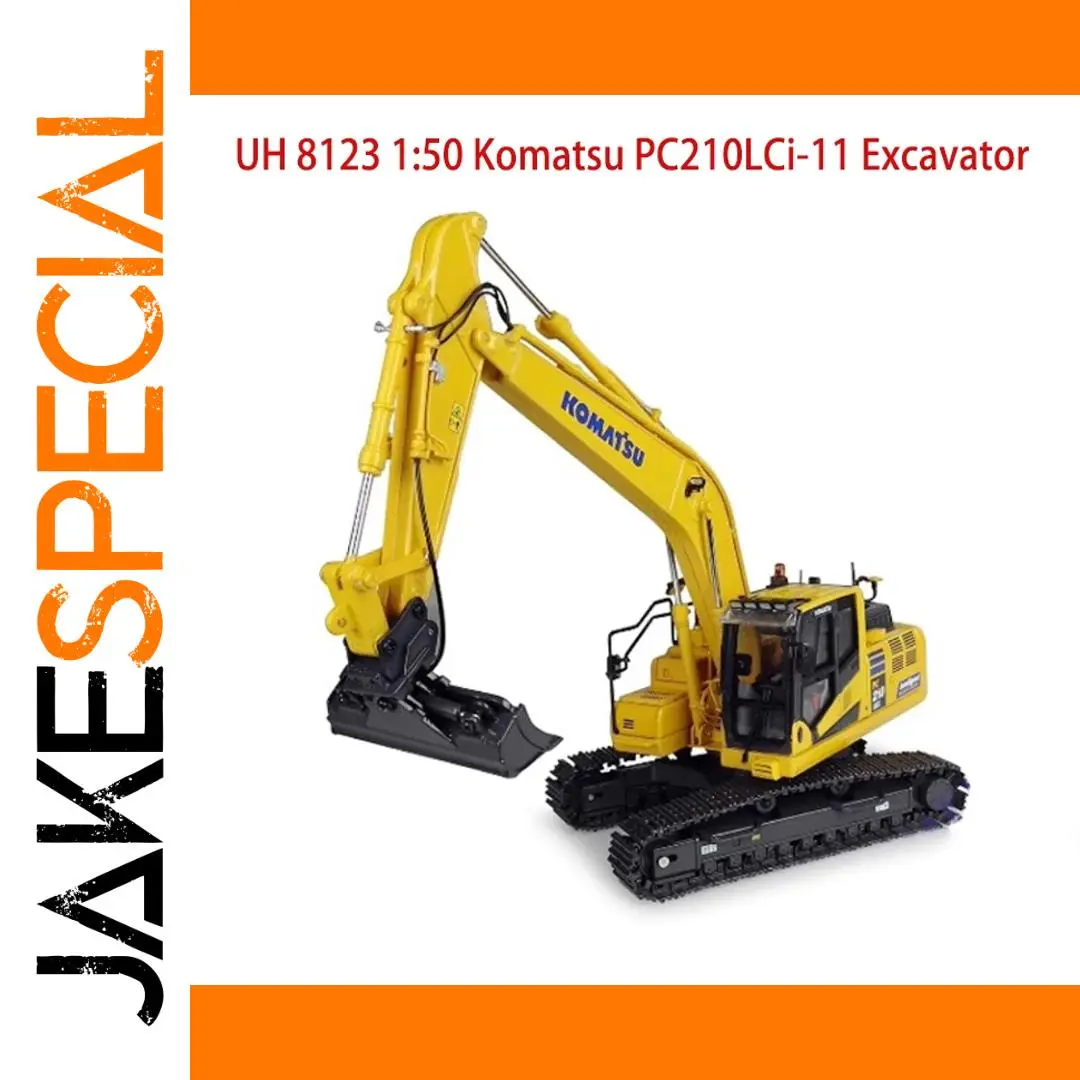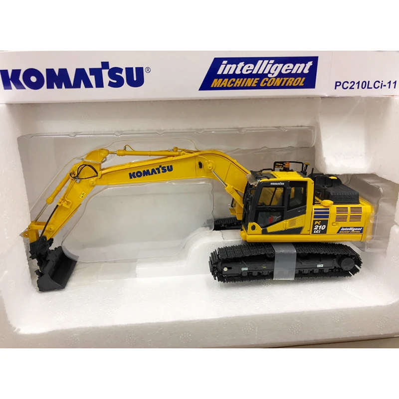This detailed diecast alloy and plastic model of the Komatsu PC210LCi-11 excavator is scaled at 1:50, measuring approximately 23 cm in length, 6 cm in width, and 7.5 cm in height. Featuring a bright yellow finish, highly realistic articulated arm with black and silver hydraulic hoses, and a serrated black bucket, the model captures the true essence of construction machinery. The cab boasts transparent plastic windows with a rounded ergonomic shape, complemented by small antennas and lights. Its detailed side vents, black accents, and textured surface elements give a rugged industrial look. Ideal for adult collectors, gifts, home decor, or display, offering authenticity and craftsmanship in every detail.
