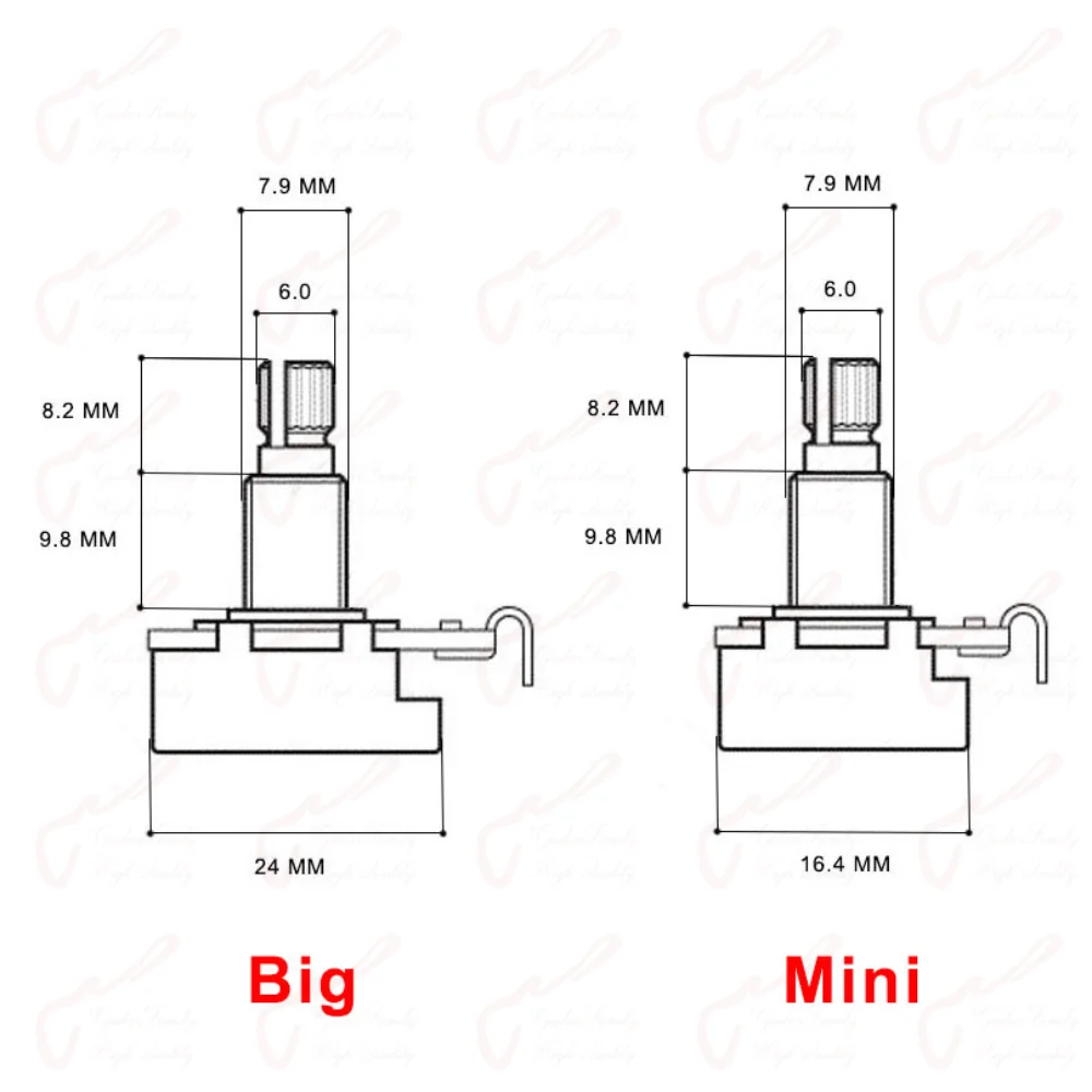 - Available in various resistance options including 250K and 500K, in sizes ranging from mini to large, suitable for all guitar control applications.