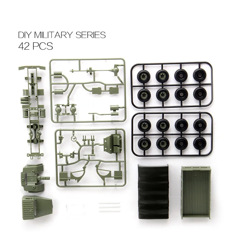 Experience the rugged realism of this detailed 1:72 scale KRAZ260 heavy-duty military truck assembly model. Crafted from durable ABS plastic, it features 42 meticulously designed parts that capture the robust and utilitarian aesthetic of military transport vehicles. The model showcases an olive green finish, complemented by a matte black cargo cover that curves smoothly over the rear section. Its front includes a prominent, slightly sloped rectangular grille with horizontal slats, round headlights in rectangular mounts, and small side mirrors extending from the cab. The cab has sharp-edged, boxy geometry with a textured, ribbed roof adding realism. The six deep-tread black tires with silver hubcaps emphasize its powerful, heavy-duty design, making this model perfect for display or assembly enthusiasts seeking authentic military vehicle replicas.