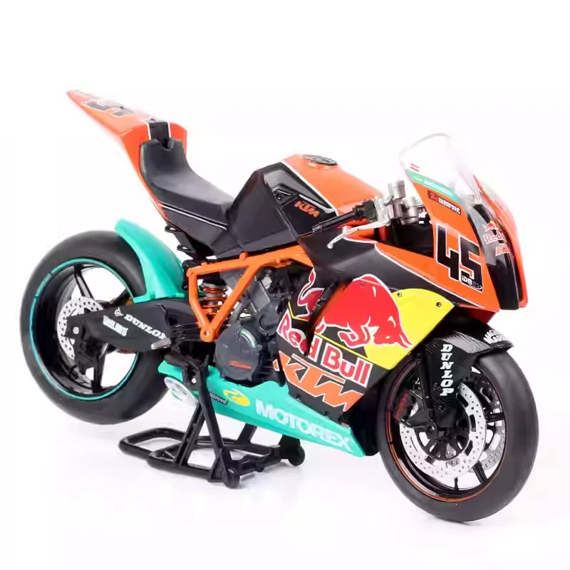 Imagine owning a piece of racing history with this intricately crafted 1:12 scale KTM RC8 1199 motorcycle model. Designed from diecast metal, it combines durability with realism, capturing every detailed aspect of the original racing bike. Its vibrant orange finish is contrasted by bold black and white accents, including racing numbers and sponsor logos like Red Bull KTM, Motorex, and Akrapovic, giving it an aggressive and sporty aesthetic. The fluorescent yellow panels on the side fairings add lively contrast, enhancing its energetic appeal. The model’s realistic mechanical features, including detailed wheels, disc brakes, and sprockets, make it an impressive display piece. Perfect for enthusiasts, this model exudes the sleek, aerodynamic style associated with professional racing motorcycles.