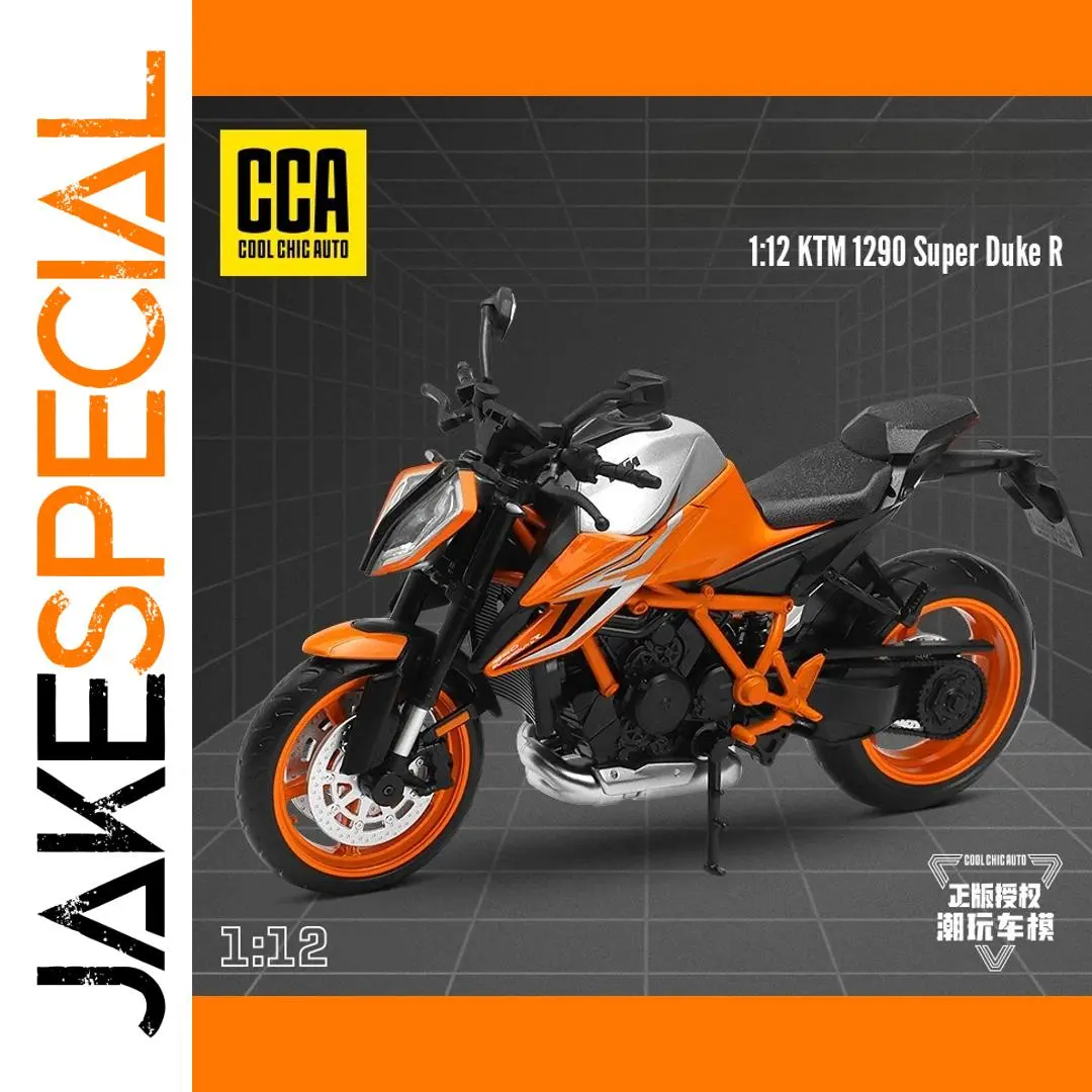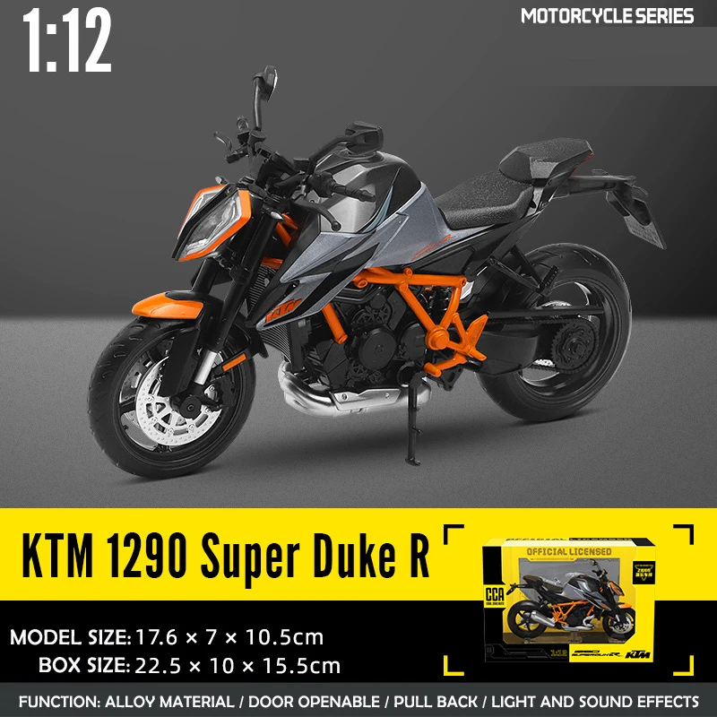 - This 1:12 scale diecast model replicates the genuine KTM1290 Super Duke R motorcycle, emphasizing vivid orange accents on the frame and wheels with a sleek black body. Perfect for display or collection.