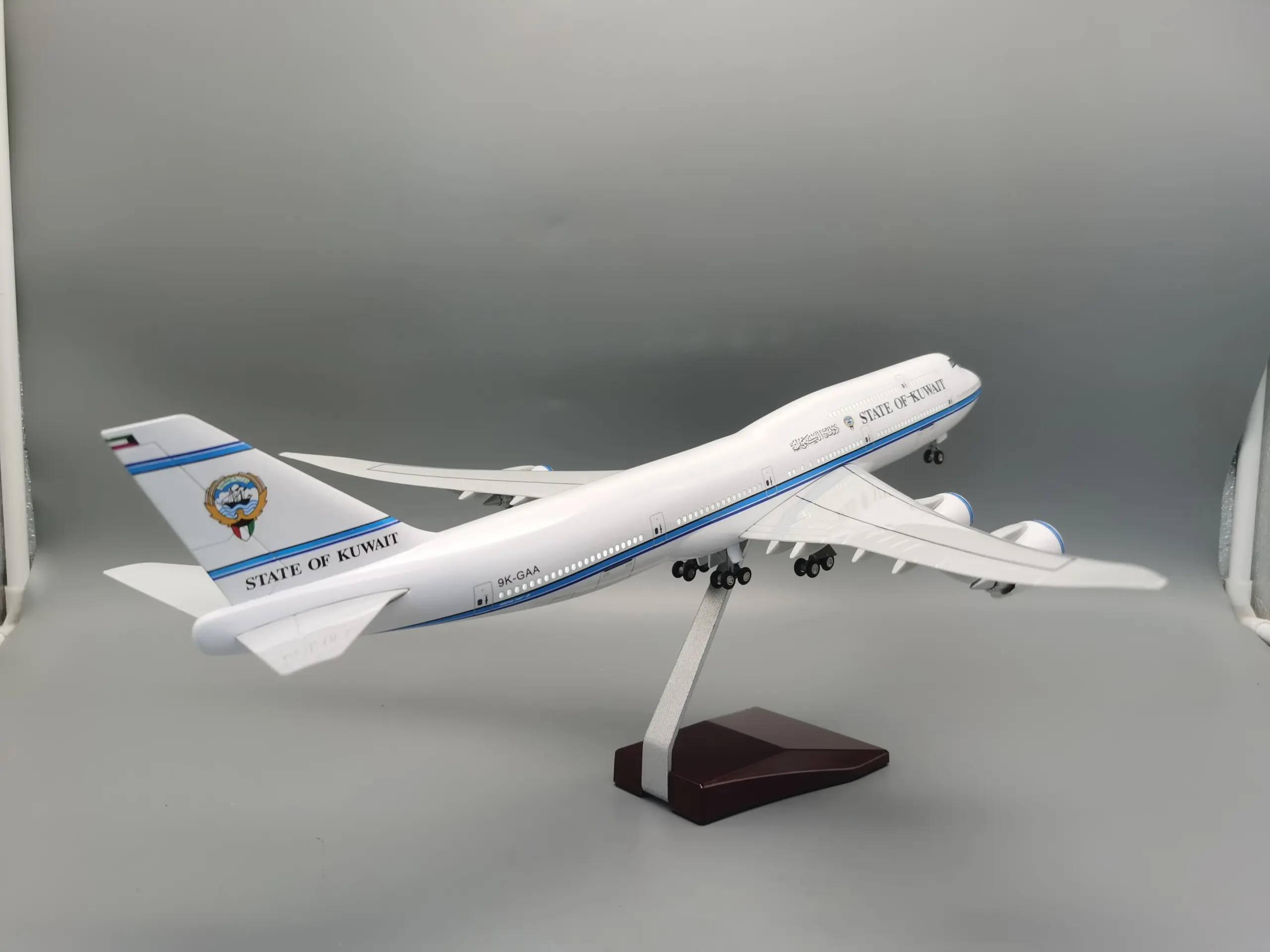 Imagine owning a stunning 1:150 scale replica of the Kuwait Airlines Boeing 747-8, measuring approximately 17.32″ in length and 18.5″ wide. This exquisite model captures the sleek, modern design with a pristine white fuselage accented by vibrant blue details and intricate markings. Its detailed logos, including “STATE OF KUWAIT” on the side and the national emblem on the tail fin, evoke a sense of authenticity. The model features a smooth, aerodynamic body with detailed winglets and delicate Arabic script near the cockpit. With LED voice control lighting that activates with sound or touch, it combines realism with innovative tech. Placed on a sturdy wooden trapezoidal base with a metal bracket, this model is perfect for display and conversation starter.