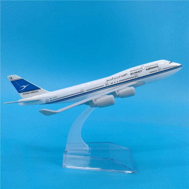 Bring home a stunning 16 cm diecast model of a B747 Kuwait Airways aircraft, scaled at 1:400 for an authentic display. Crafted from high-quality metal, this collectible showcases a sleek white fuselage accented with bold black lettering, detailed Arabic script, and a vibrant blue tail fin with a white stylized bird logo. The streamlined wings feature slightly upward-curved wingtips, with etched or painted windows and doors adding intricate realism. Mounted on a clear display stand, this non-functional model offers a sophisticated, realistic look perfect for aviation enthusiasts and collectors aged 14 and above, highlighting precise craftsmanship and elegant design.