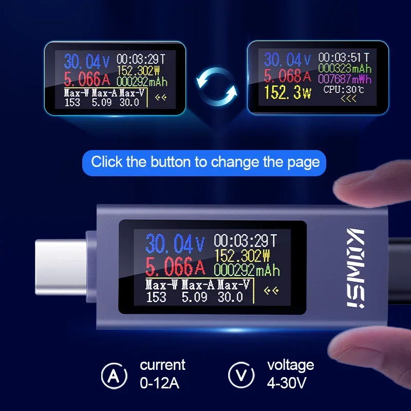 - Measures DC voltage from 4V to 30V, current from 0A to 12A, and supports a maximum power of 360W, suitable for diverse charging and testing needs.