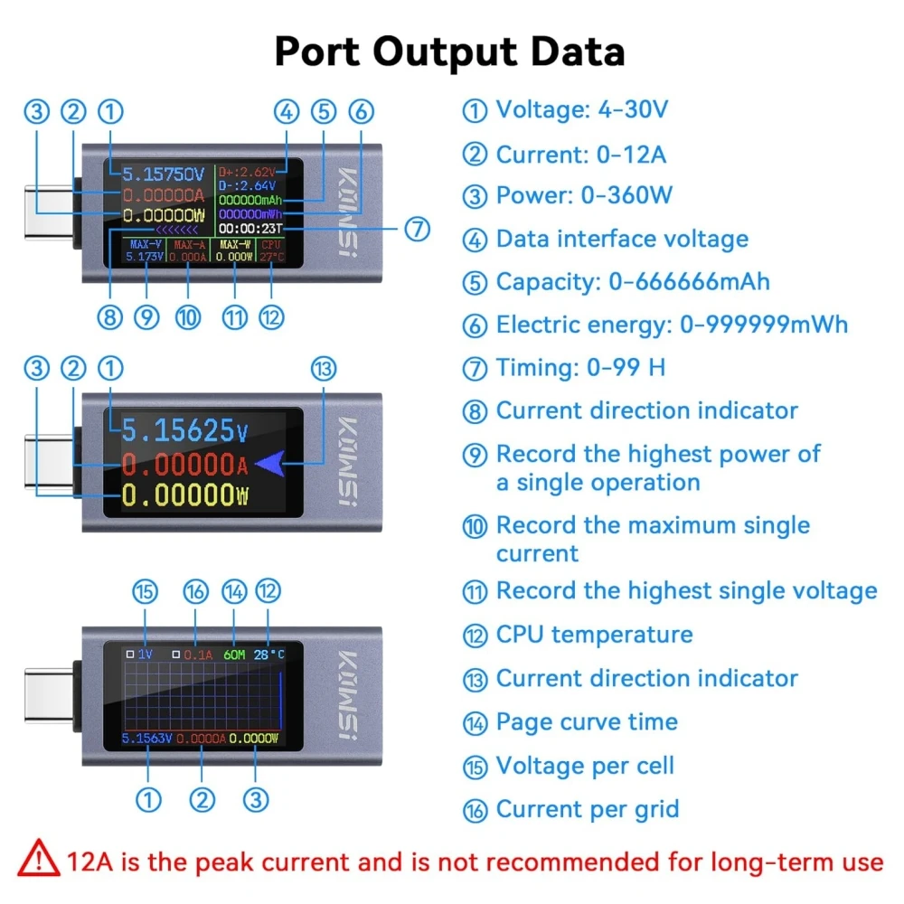 - Provides real-time monitoring of voltage (4-30V), current (0-12A), power (up to 360W), and energy, ensuring precise control of your charging and measurement tasks.