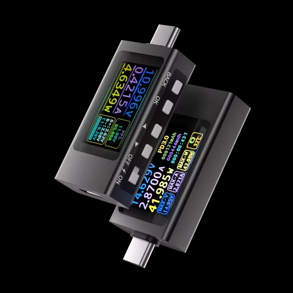 Experience precise and reliable testing with the KWS-X1 digital Type-C tester, voltmeter, and ammeter. Encased in a rugged, CNC-machined metal body, this compact device measures voltage from 3.3V to 40V, current up to 12A, and power up to 380W, making it ideal for fast charging protocols like QC3.0/4.0, PD, OC2.0/3.0, and MTK standards. Its 54.96 x 24.45 x 11.15 mm HD IPS display features three customizable pages, real-time power detection, curve and ripple measurement, and automatic protocol detection. Built for durability and precision, it is the perfect tool for tech enthusiasts and professionals.