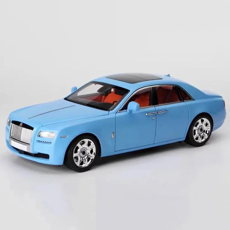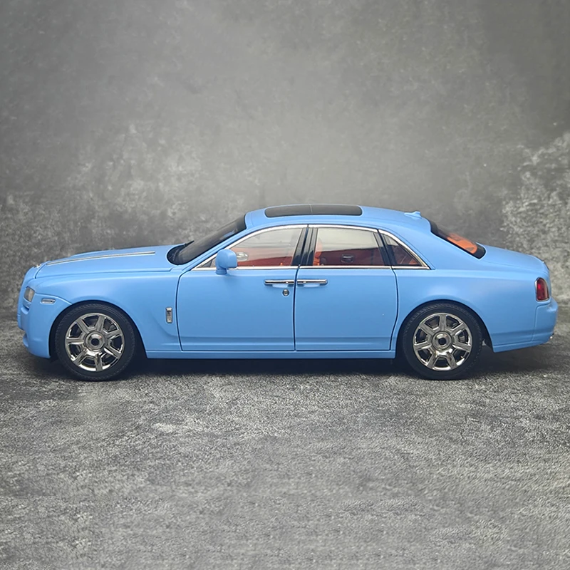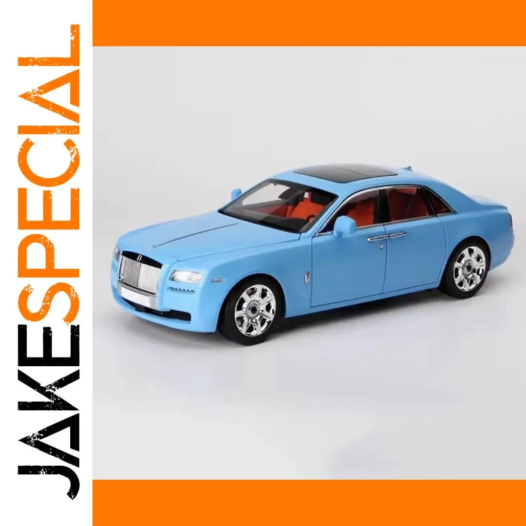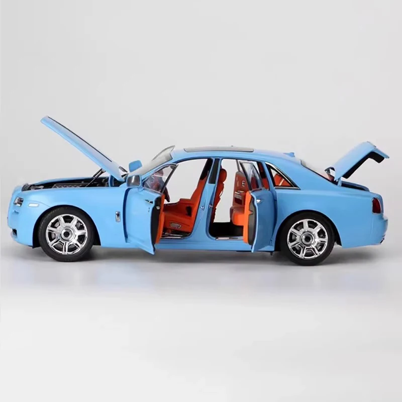 Experience the elegance of this highly detailed Kyosho 1:18 scale Ghost sedan alloy model. Measuring about 29 cm in length, 12 cm in width, and 9 cm in height, this static display piece captures modern luxury's sleek, flowing lines. Its vibrant light blue finish, combined with a glossy surface, emphasizes its stylish and contemporary design. The front showcases a prominent grille with vertical slats, flanked by rectangular headlights seamlessly integrated into the body. The black roof creates a striking contrast, while the clear, slightly tinted windows reveal a bold orange interior. The alloy wheels feature multi-spoke rims with detailed tires, and the front wheels can turn through a linked steering mechanism. Perfect for collectors who appreciate realism and style, this model elevates any display value.