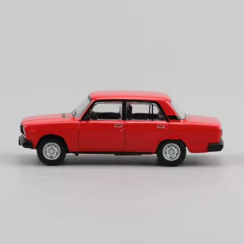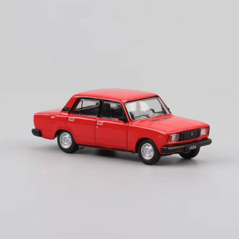 Immerse yourself in the nostalgic charm of the this detailed 1:64 scale diecast model of the LADA 2105 Classic Sedan. Crafted from durable metal, plastic, and rubber, this miniature captures the iconic boxy silhouette of the Soviet-era sedan with precision. Available in striking red and sleek white, each model features shiny surfaces, smartly defined windows, side moldings, door handles, and side mirrors for added realism. The front showcases rectangular headlights and a black grille, complemented by black bumpers. Its compact size of approximately 7.2 cm long and 3 cm wide makes it a perfect collectible or decorative piece. This model invites you to cherish a piece of automotive history in your collection or display case.