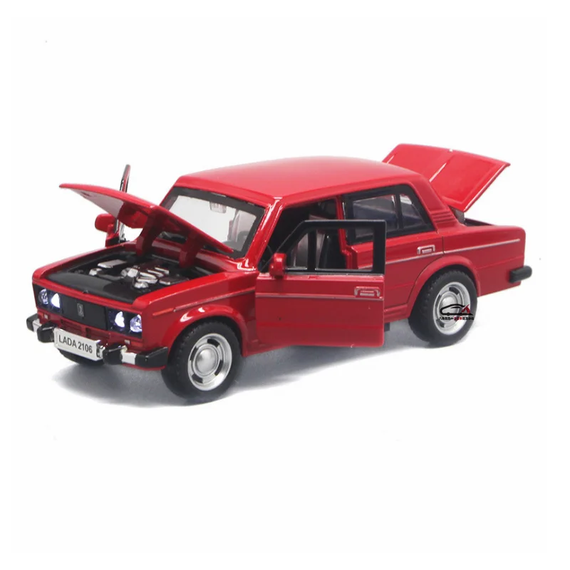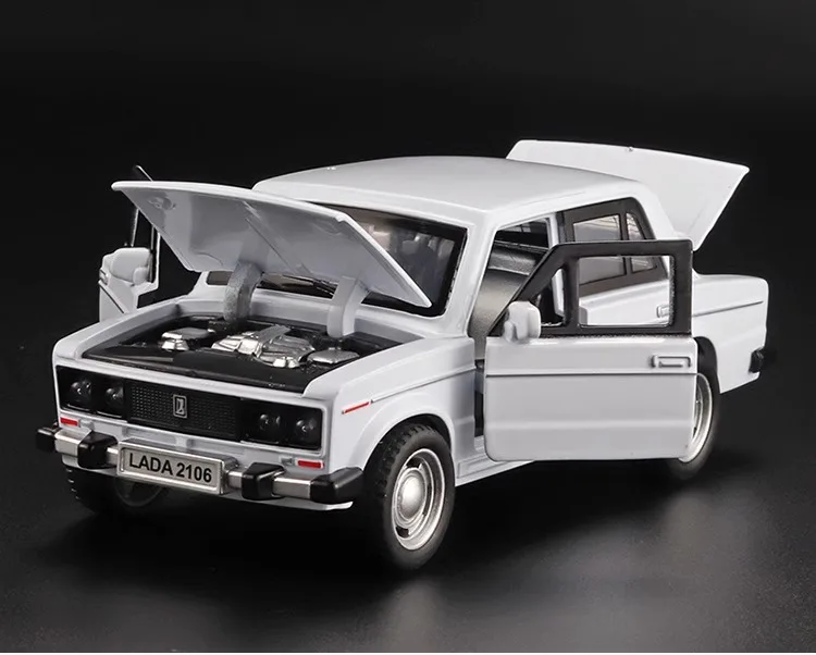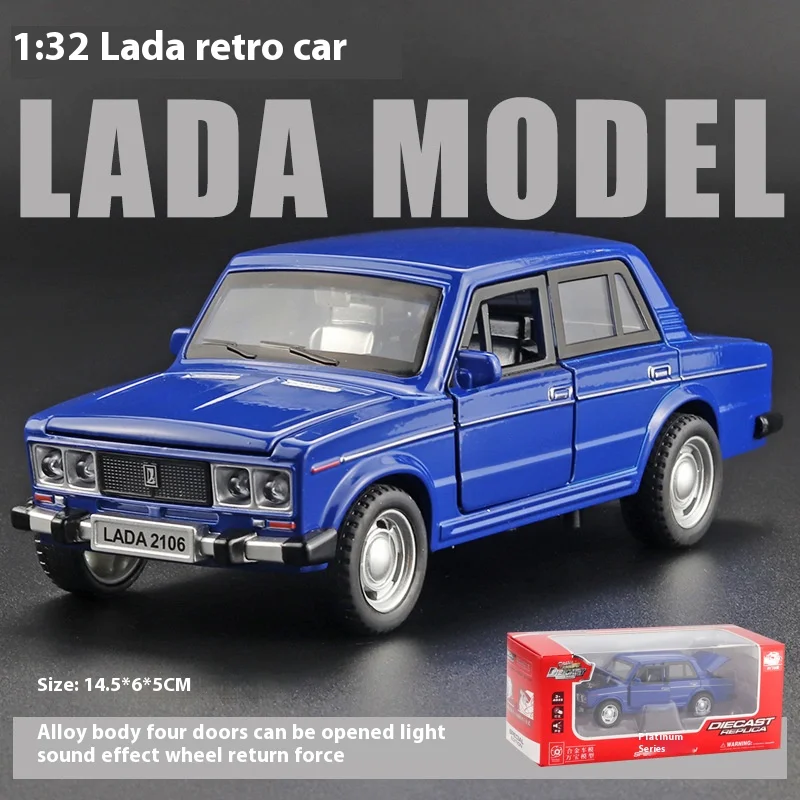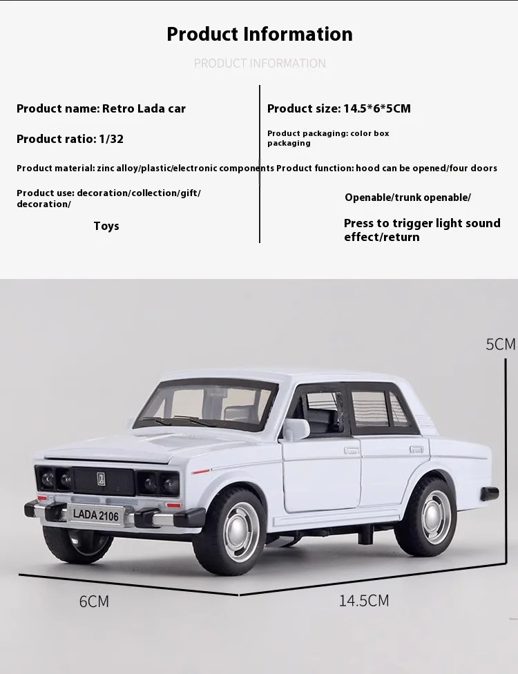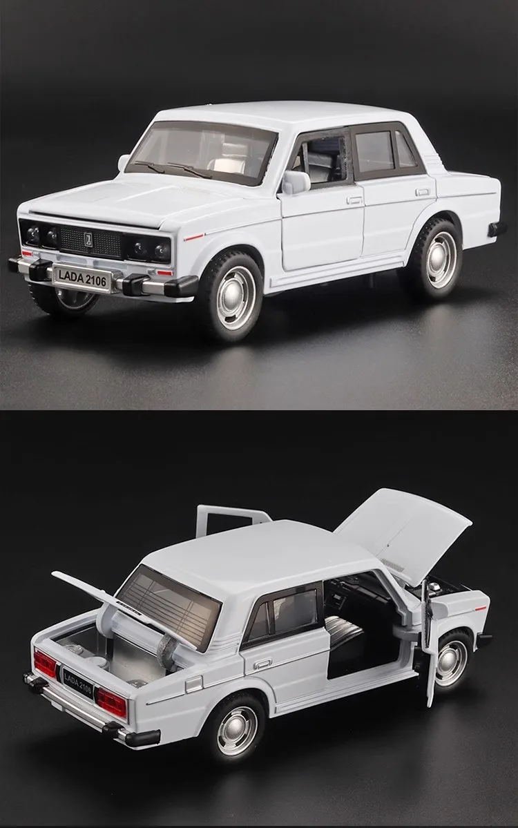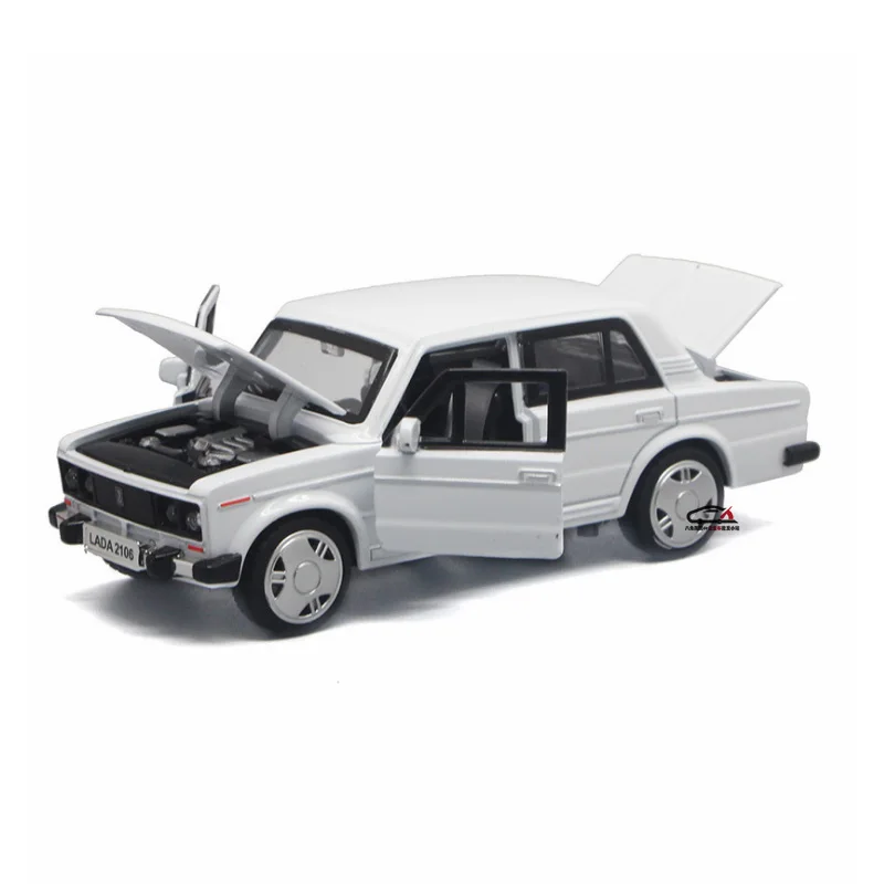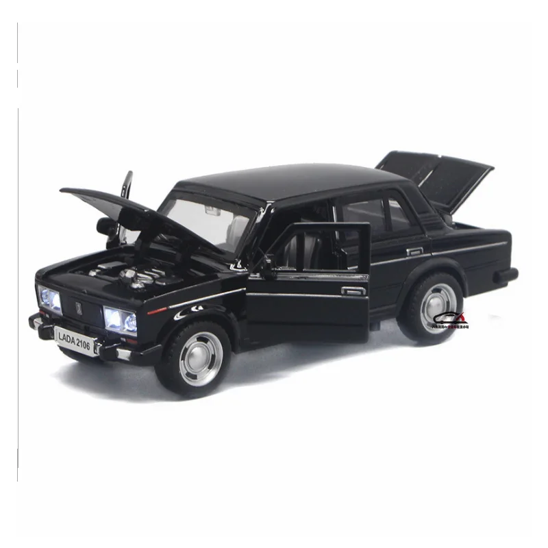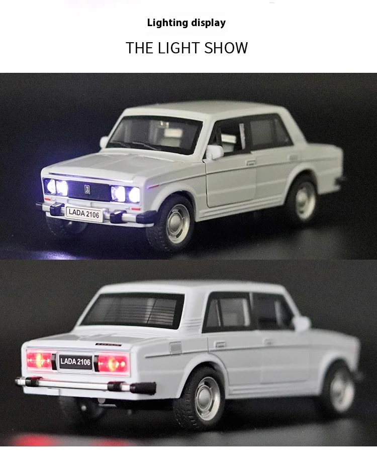 The 1:32 scale alloy diecast model of the LADA 2106 is a stunning collectible featuring intricate details and battery-operated sound and light functions. Crafted from durable metal, this model captures the vintage aesthetic with its boxy shape, angular lines, and realistic embellishments. It boasts clear headlights and taillights, along with a license plate that reads “LADA 2106.” Available in striking colors such as white, red, black, and blue, its well-defined wheels, shiny hubcaps, and black rubber tires enhance its authenticity. Perfect for display, this model pays homage to the classic Russian vehicle, making it an ideal gift for enthusiasts.