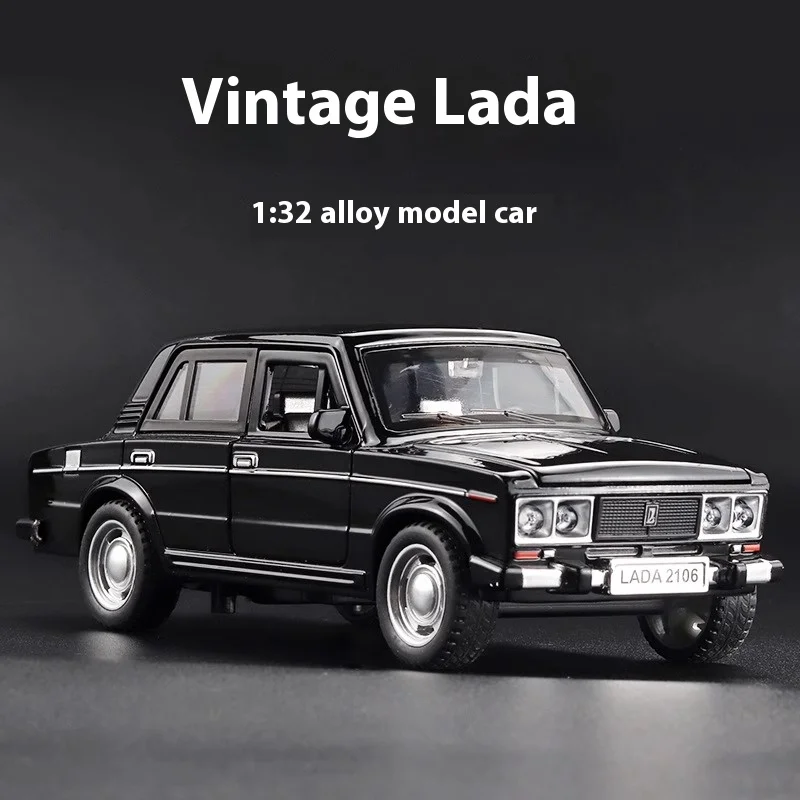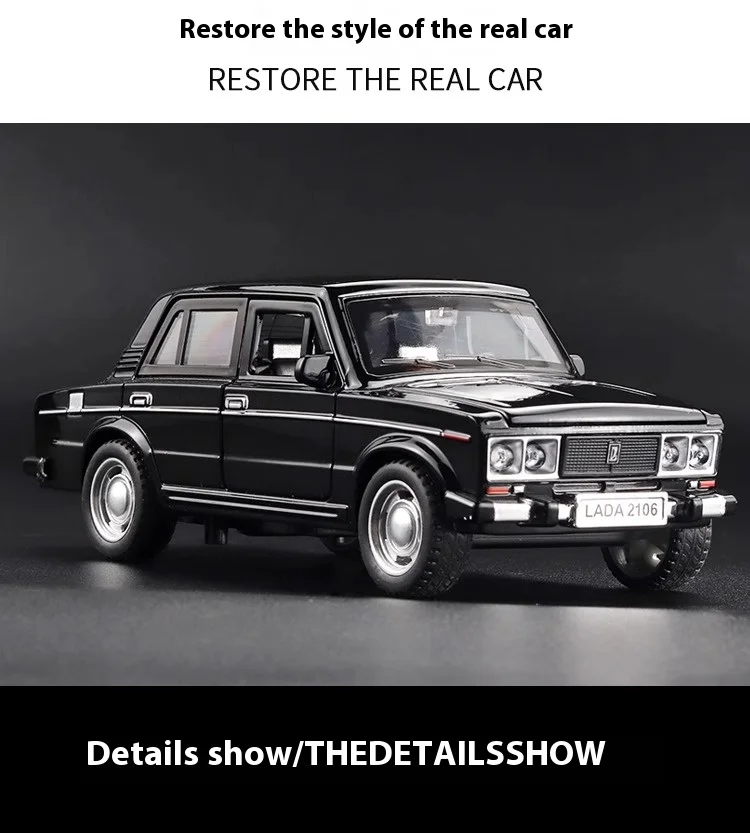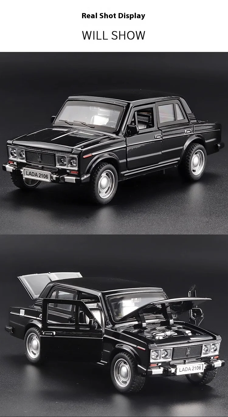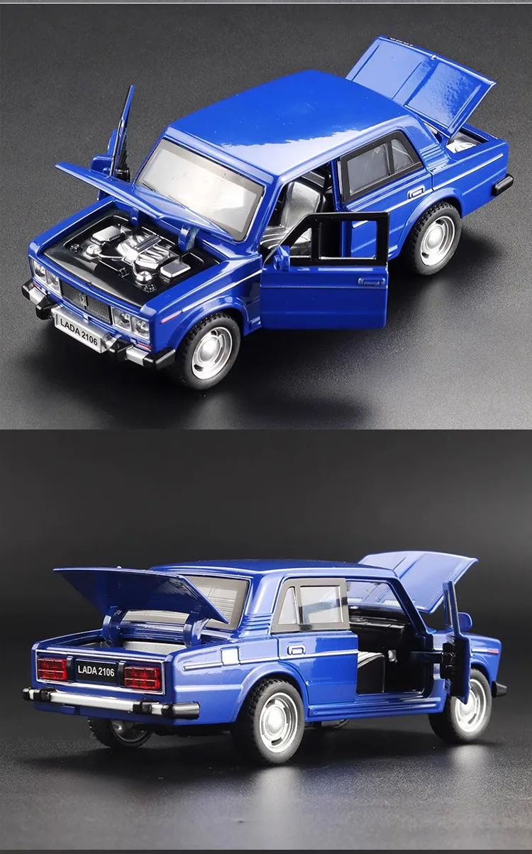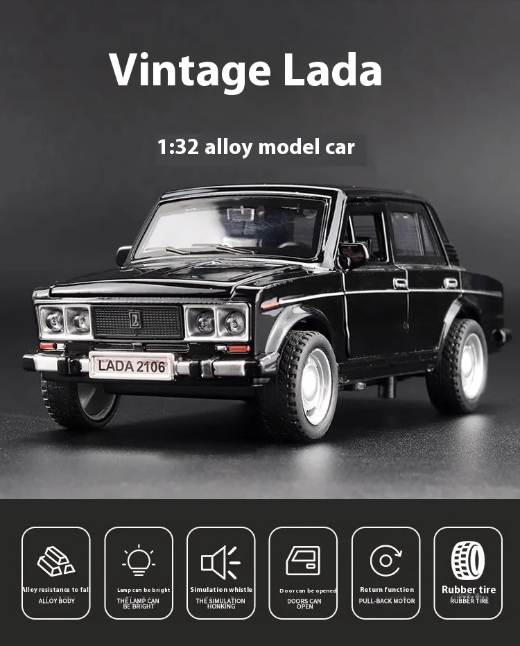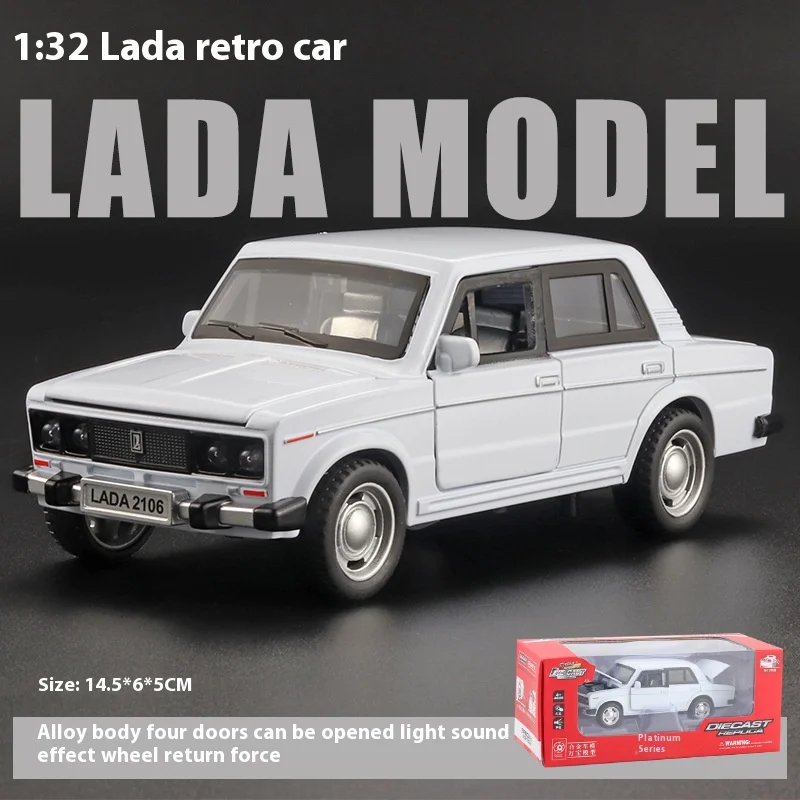 The 1:32 scale alloy diecast model of the LADA 2106 is a stunning collectible featuring intricate details and battery-operated sound and light functions. Crafted from durable metal, this model captures the vintage aesthetic with its boxy shape, angular lines, and realistic embellishments. It boasts clear headlights and taillights, along with a license plate that reads “LADA 2106.” Available in striking colors such as white, red, black, and blue, its well-defined wheels, shiny hubcaps, and black rubber tires enhance its authenticity. Perfect for display, this model pays homage to the classic Russian vehicle, making it an ideal gift for enthusiasts.