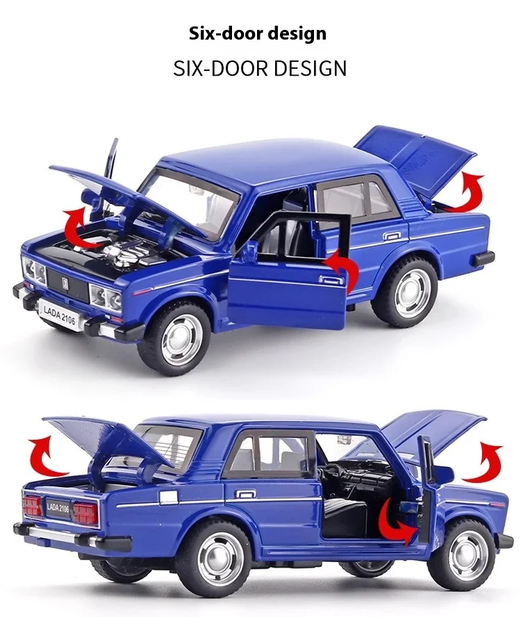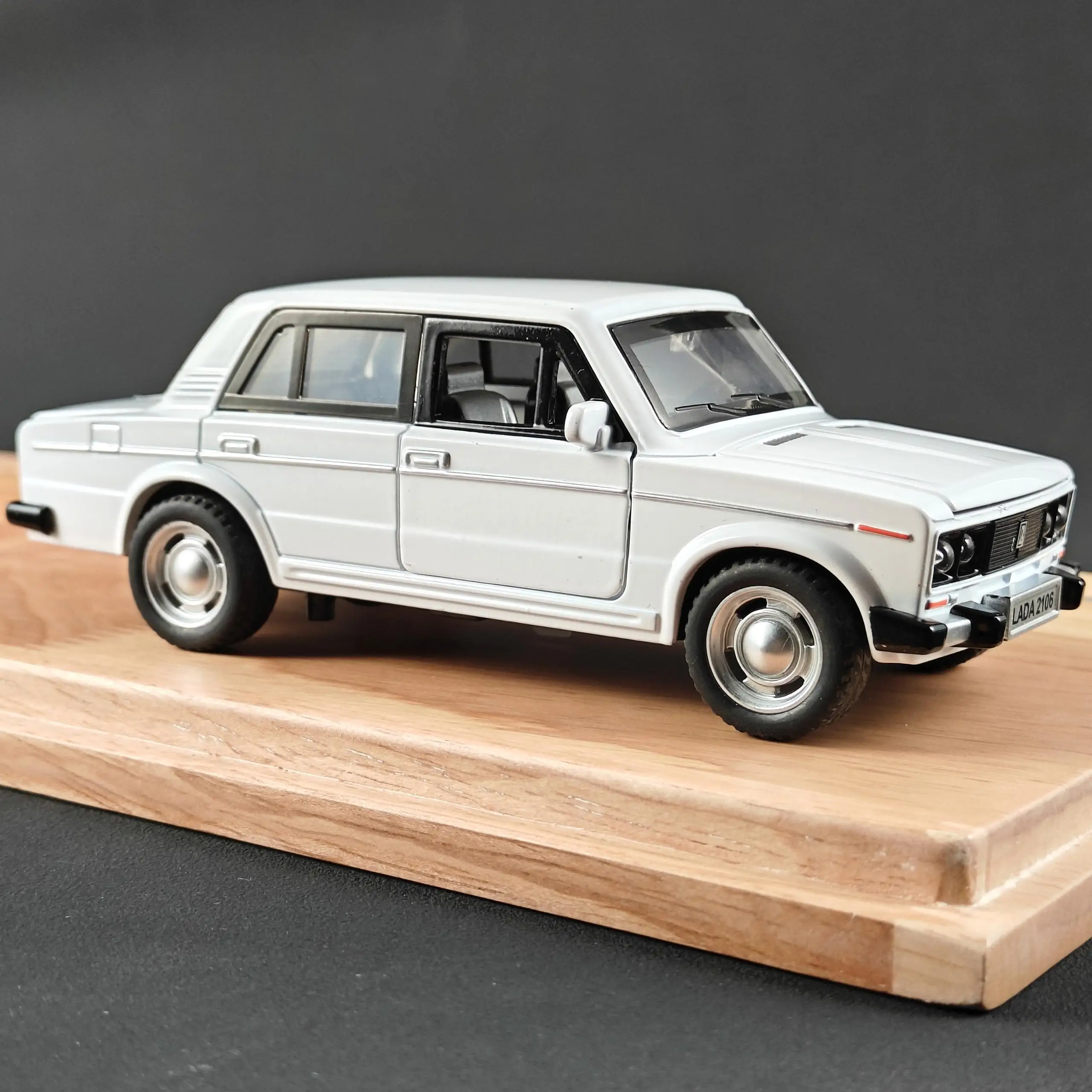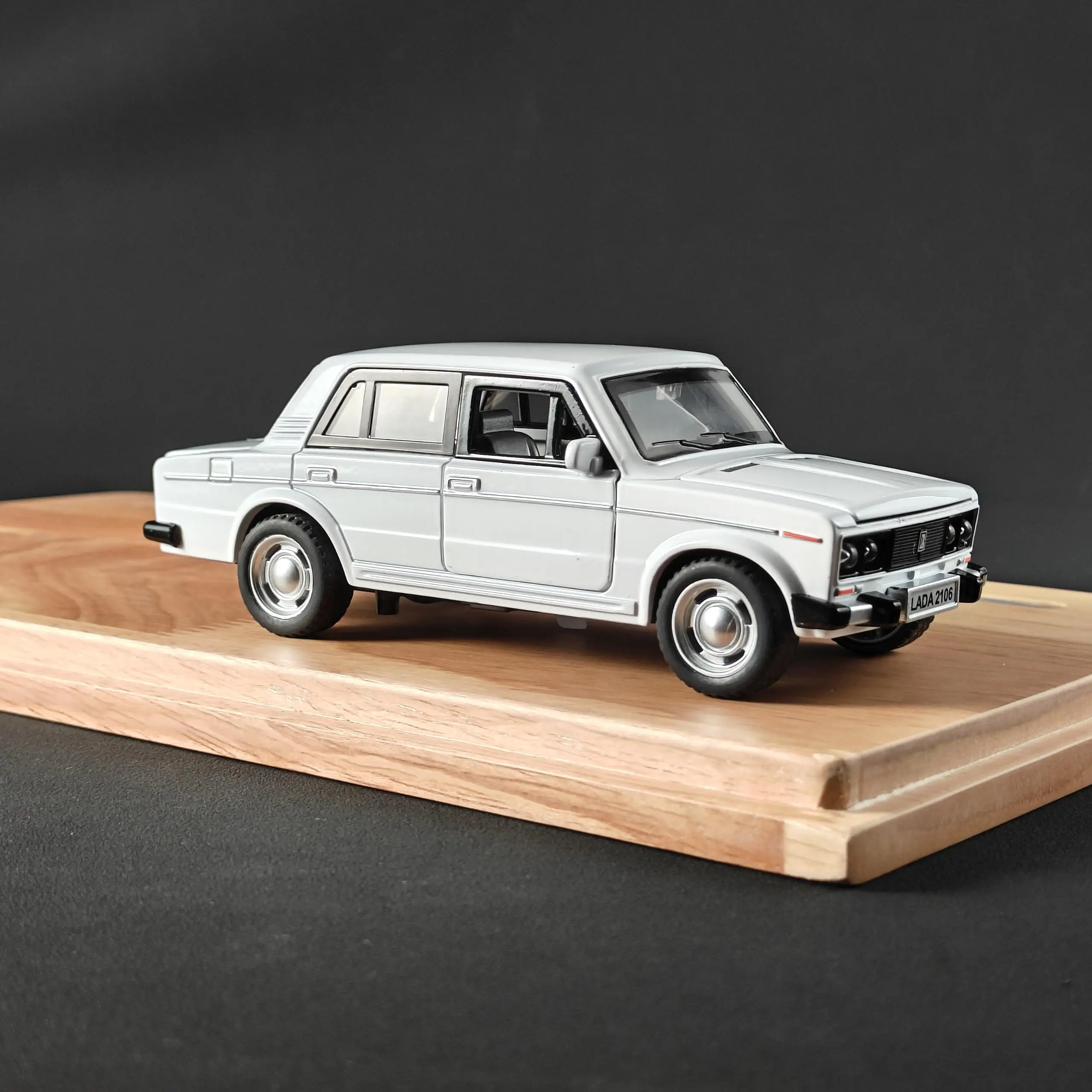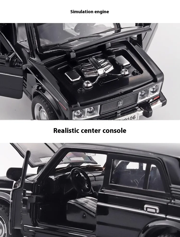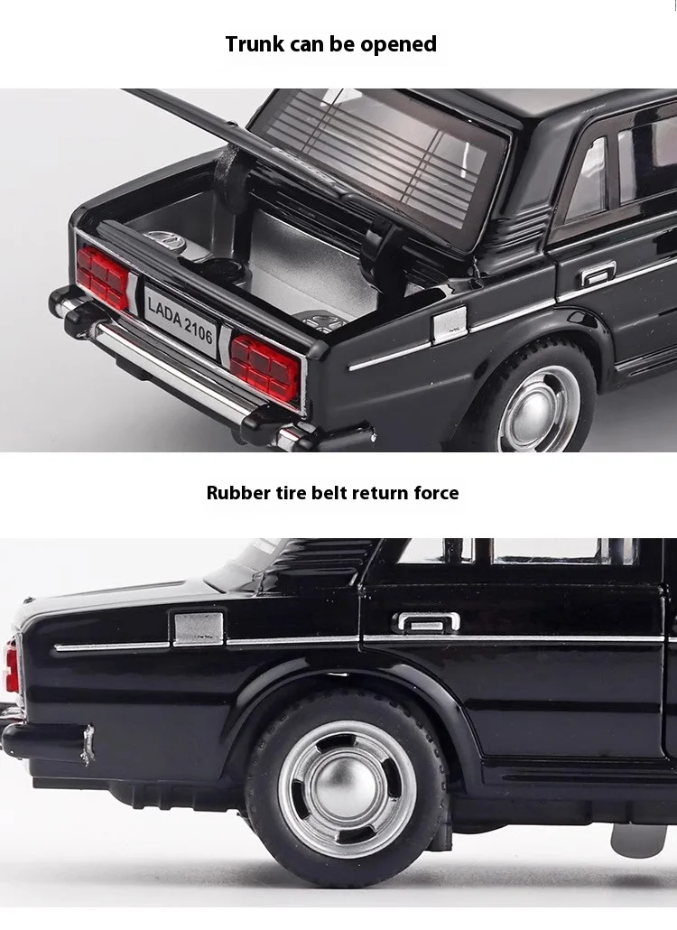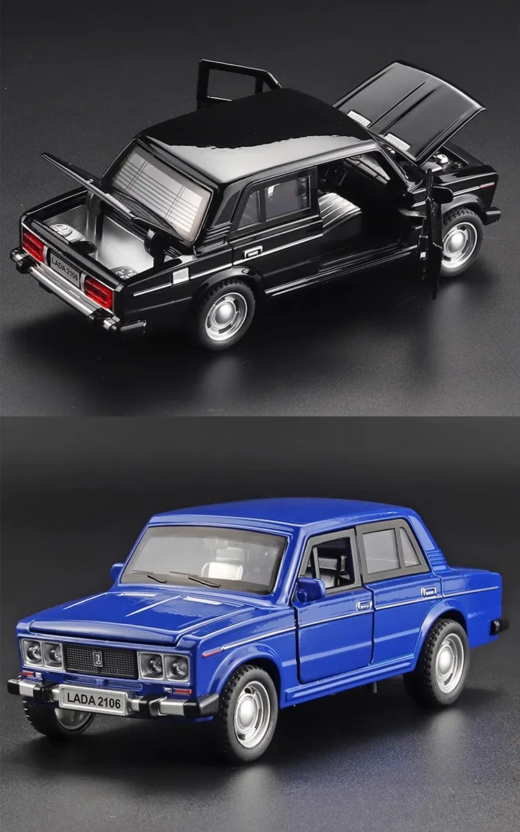 The 1:32 scale alloy diecast model of the LADA 2106 is a stunning collectible featuring intricate details and battery-operated sound and light functions. Crafted from durable metal, this model captures the vintage aesthetic with its boxy shape, angular lines, and realistic embellishments. It boasts clear headlights and taillights, along with a license plate that reads “LADA 2106.” Available in striking colors such as white, red, black, and blue, its well-defined wheels, shiny hubcaps, and black rubber tires enhance its authenticity. Perfect for display, this model pays homage to the classic Russian vehicle, making it an ideal gift for enthusiasts.