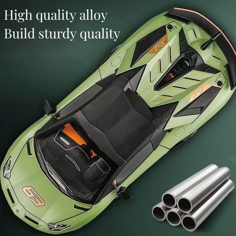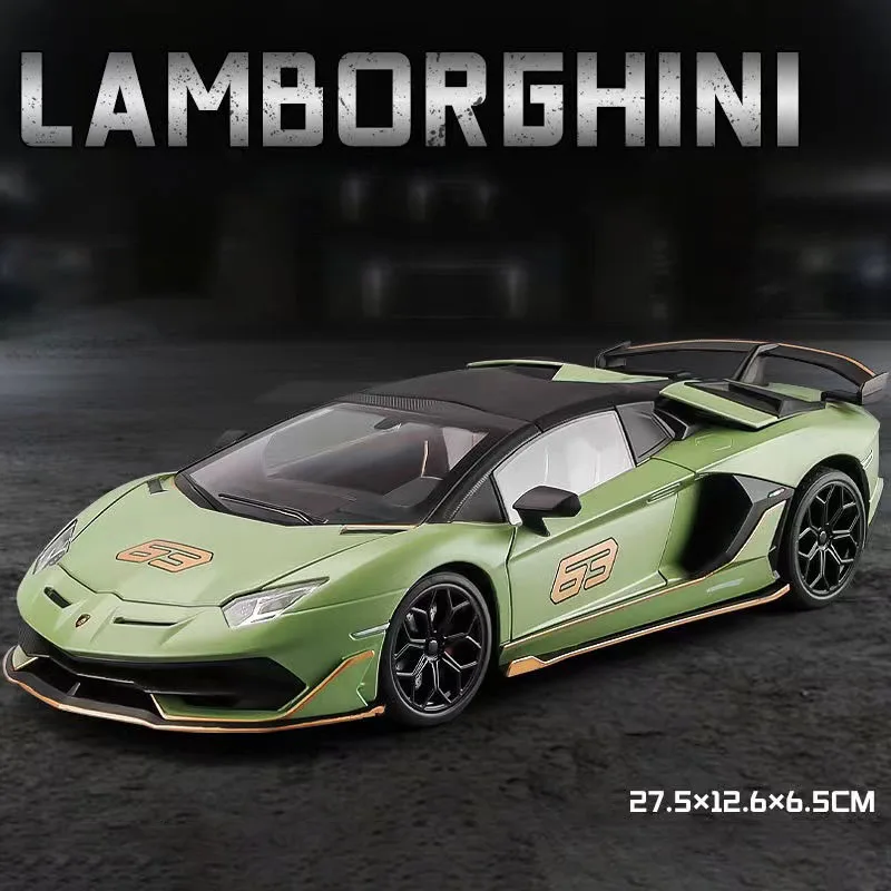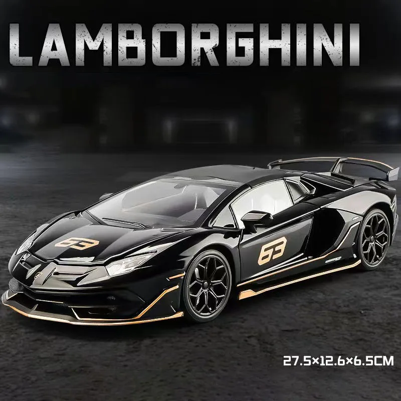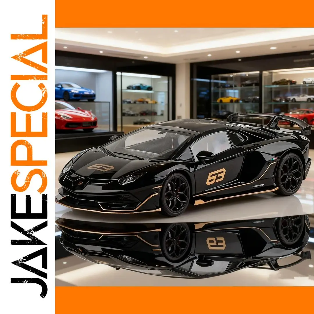 Experience owning a piece of Lamborghini’s legendary performance with this highly detailed 1:18 scale diecast alloy model of the Aventador SVJ. Crafted from premium alloy and plastic materials, this replica captures the sleek, aerodynamic lines and aggressive stance of the original supercar. Its glossy black finish accentuates the sharp contours, with striking gold-colored decals including the racing number “63” on the hood and doors. The model features realistic multi-spoke wheels with visible brake calipers, transparent windows revealing detailed interior, and a prominent rear wing/spoiler that enhances its dynamic appeal. Perfect for dedicated collectors or passionate enthusiasts, this model adds a stylish, high-performance touch to any display setting.