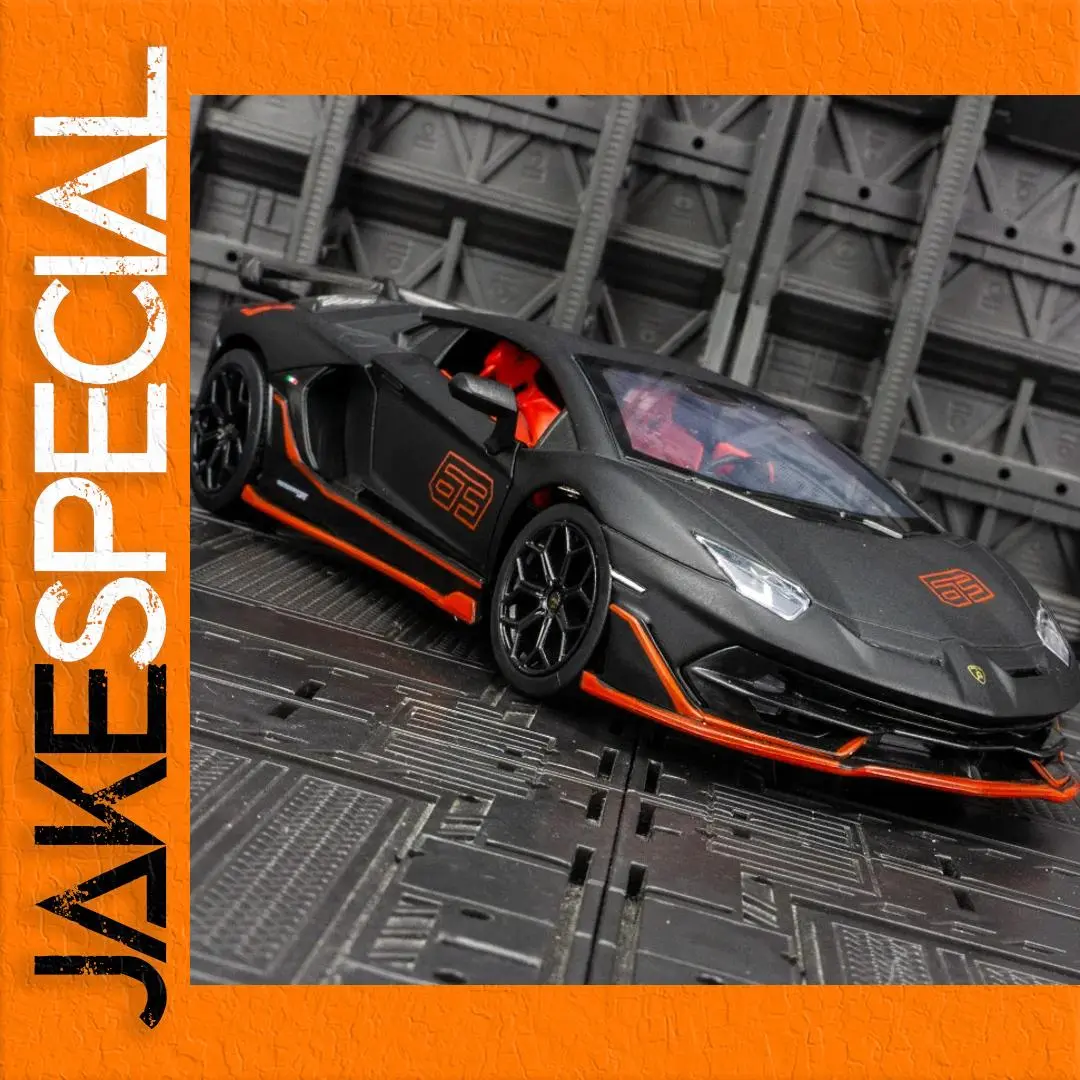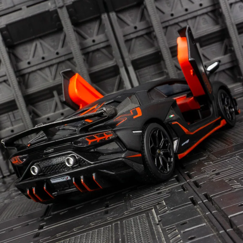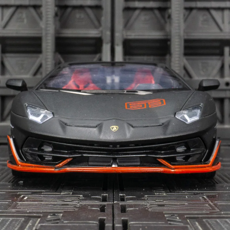 Introducing the CCA 1:24 scale diecast model of the Lamborghini Aventador SVJ 63, a striking representation of luxury and performance, finished in a captivating matte black with vibrant orange accents. This meticulously crafted metal toy car features an aerodynamic body, aggressive front bumper, and detailed black alloy wheels with a multi-spoke design. The vibrant orange highlights adorn the trim, front lip, and wheel wells, while the orange number “63” signifies its special edition status. Experience added realism with sound and light effects powered by a button battery. This collectible model showcases racing-style interior details in red, making it a must-have for enthusiasts.