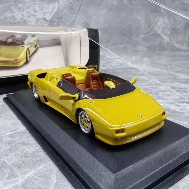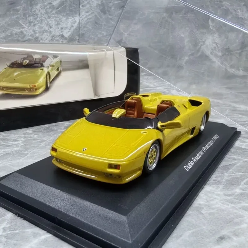 - This 1:43 scale diecast model showcases a vibrant yellow exterior highlighting its aerodynamic and sporty design, perfect for display and collection, with detailed bodywork reflecting the original Lamborghini Diablo Roadster 1992.