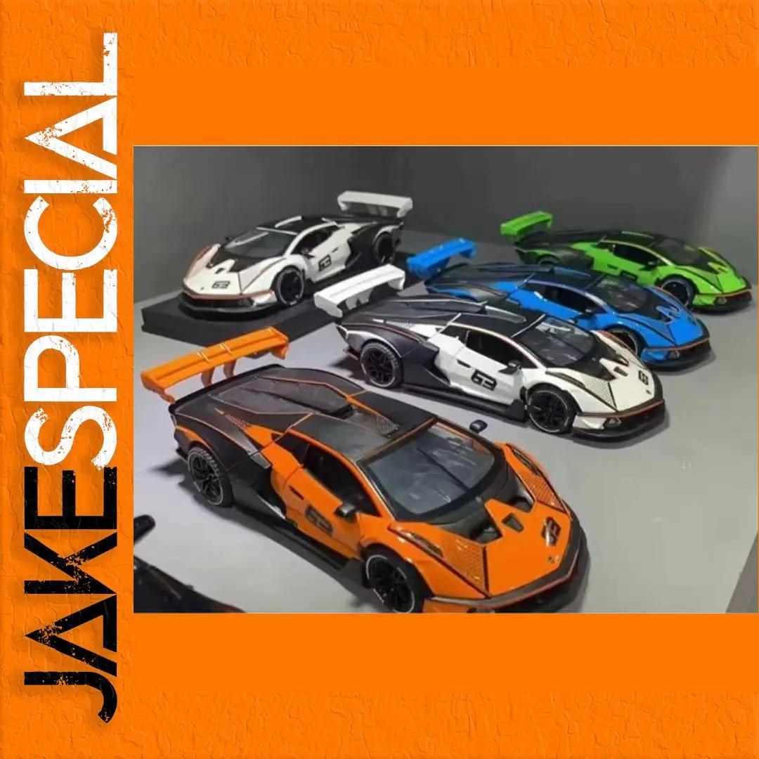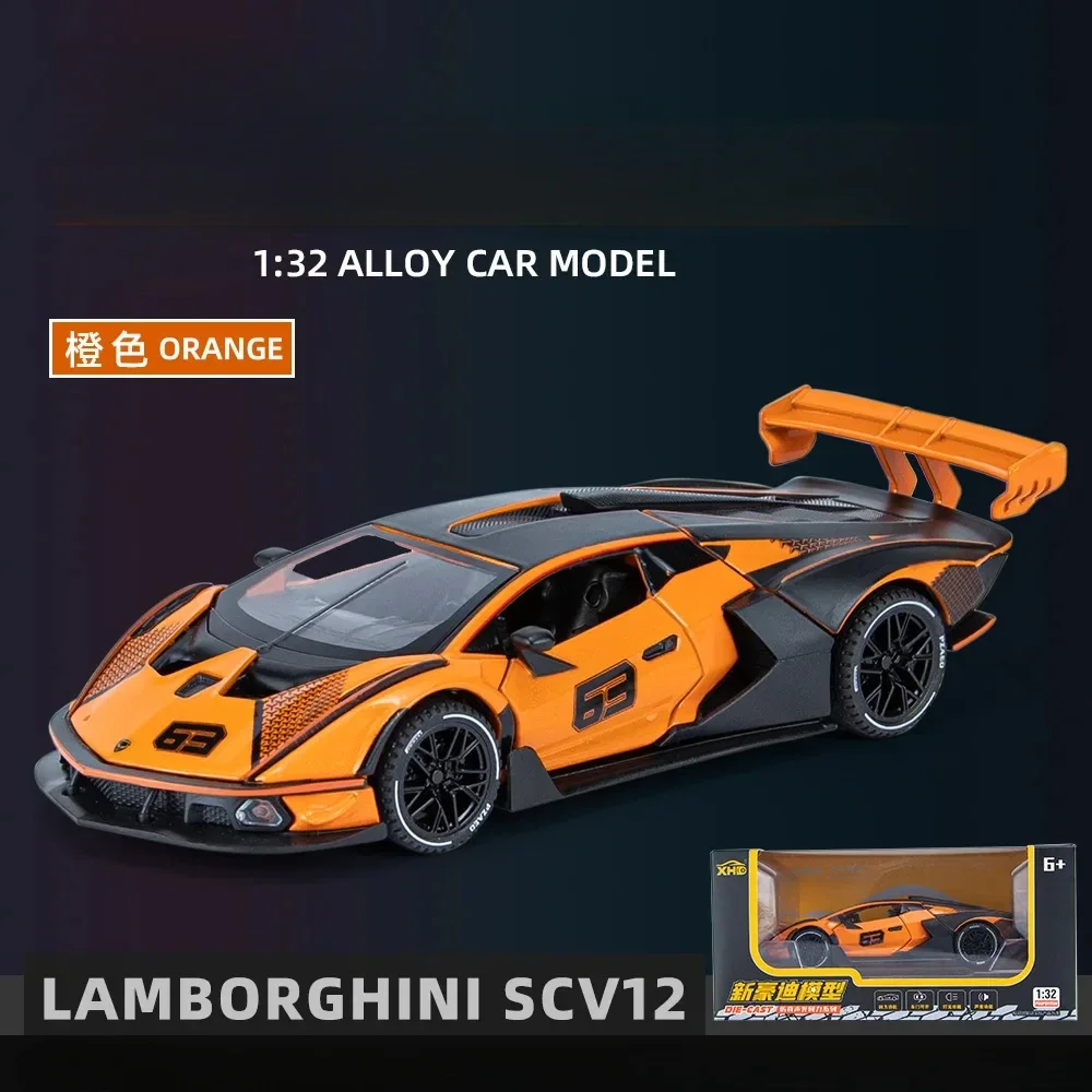 Experience the high-performance allure of the 1:32 scale Lamborghini Essenza SCV12 supercar model. This meticulously crafted diecast model car, featuring a blend of alloy and plastic, showcases five striking color variations: vibrant orange with black accents, sleek white with racing number “63,” bold blue with contrasting details, eye-catching green, and classic black. Each model is designed with intricate details, realistic wheels, and pronounced rear wings, embodying the essence of racing. Exciting sound and light features powered by a button battery enhance its appeal, making it a perfect addition to any collection. Enjoy the thrill of owning this impressive supercar replica.
