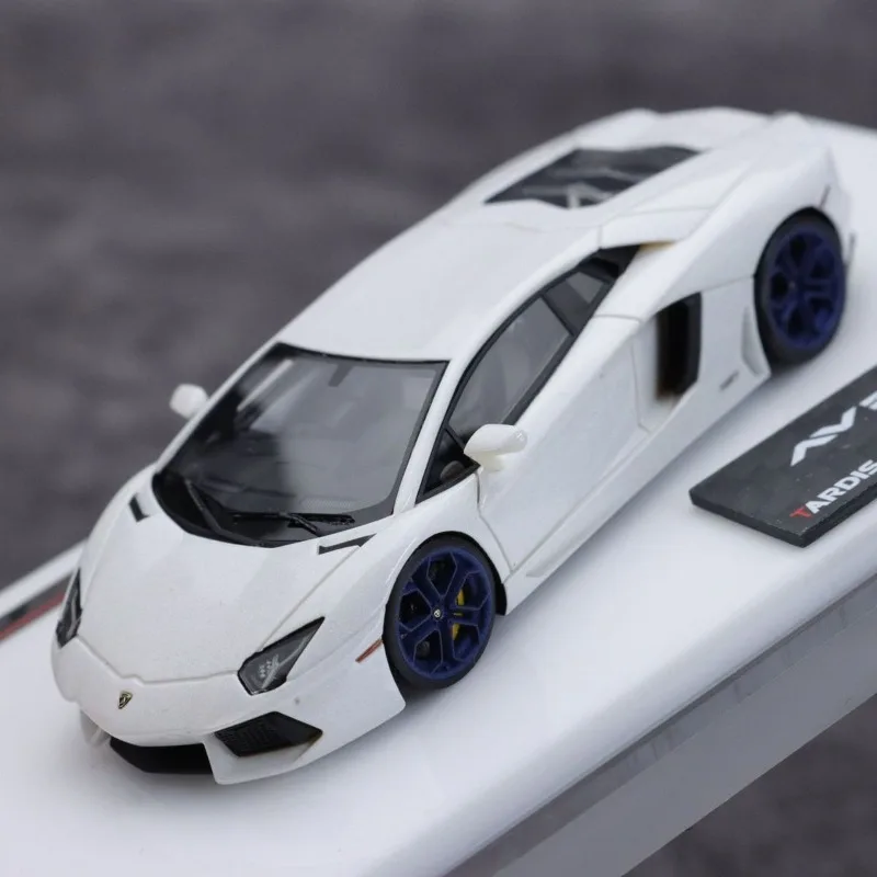 - The white version features a glossy finish with bright blue multi-spoke wheels, angular headlights, a low nose, and a seamless large windshield extending into a black roof section, enhancing realism.