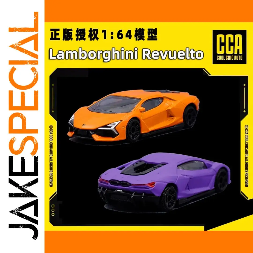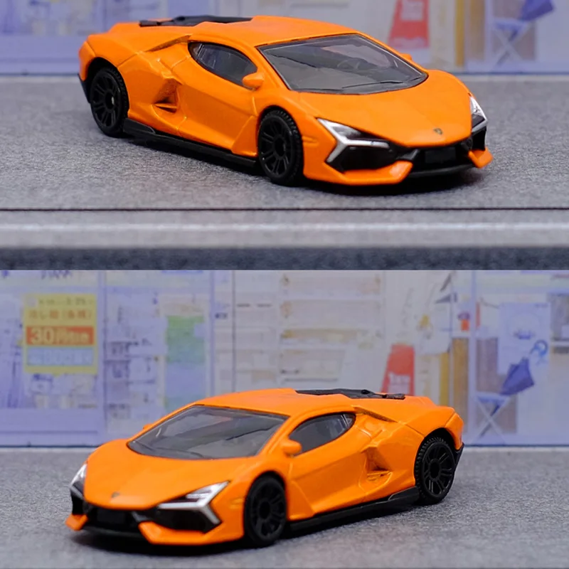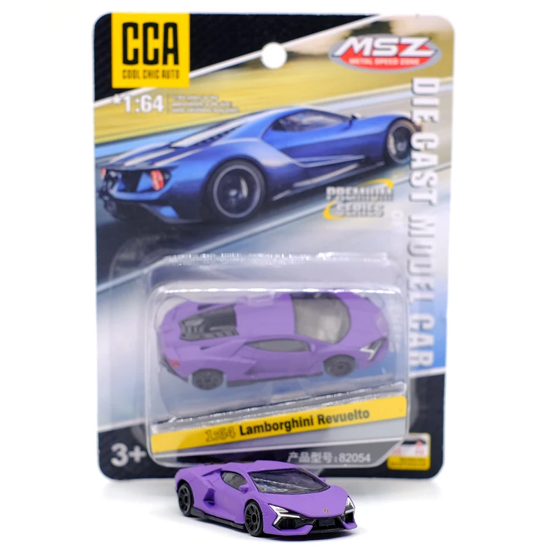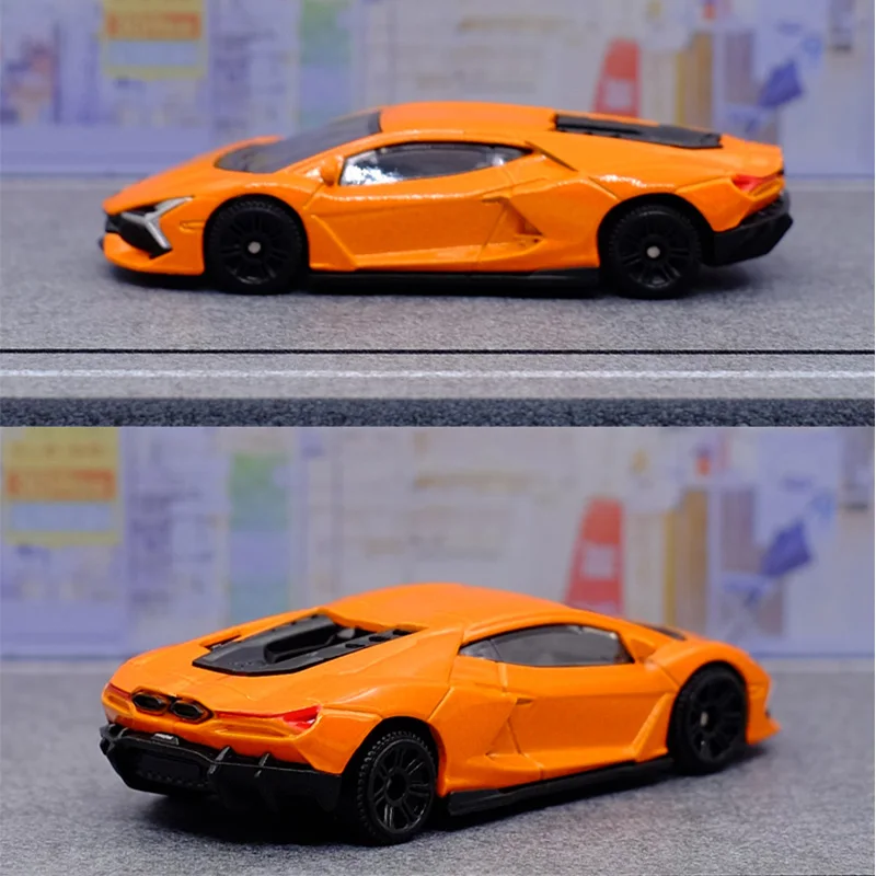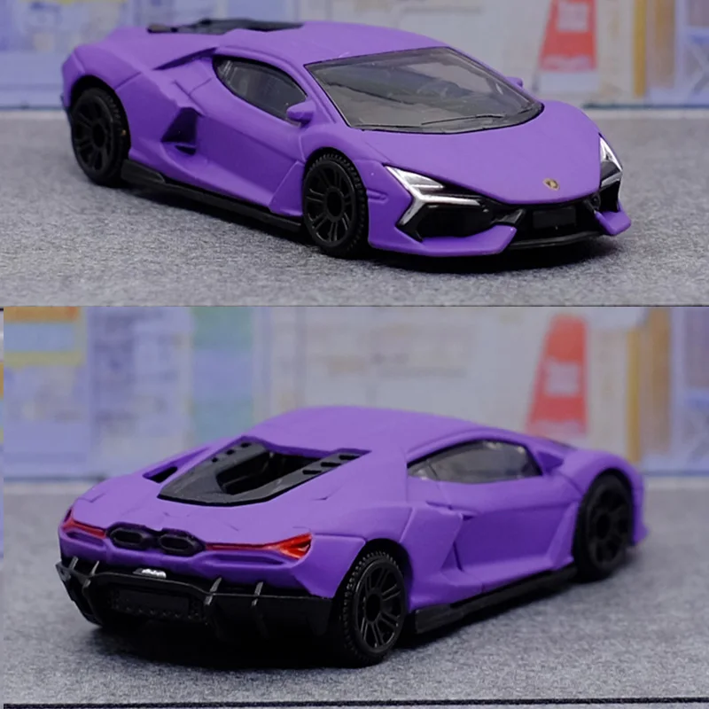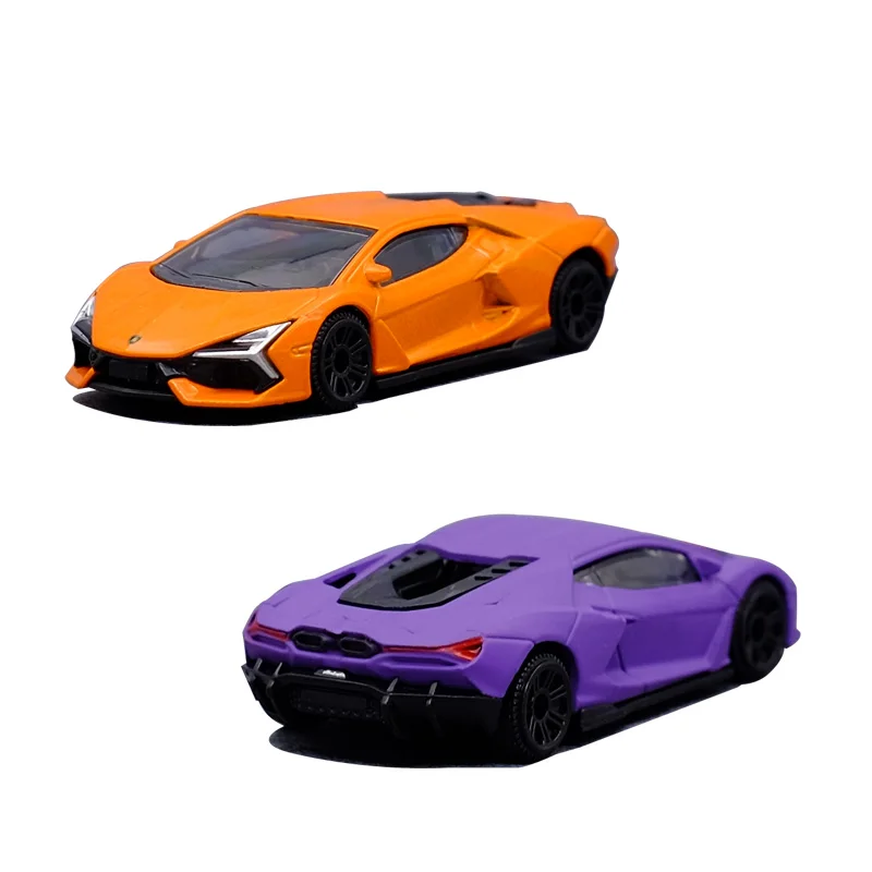 Experience the sleek design and vibrant colors of this 1:64 scale Lamborghini Revuelto diecast model, measuring approximately 7 cm in length. Crafted from durable alloy and plastic, it boasts four-wheel shock absorption and sliding functionality, allowing for smooth, realistic movement. The model features aerodynamic, modern contours with sharp lines and flowing curves, available in eye-catching matte purple and bold matte orange finishes. Its detailed construction includes black accents, clear windows, and rear features like taillights and exhaust outlets for an authentic look. Packaged in a vibrant color box, this collectible is perfect for adult enthusiasts and adds a touch of sporty elegance to any collection.