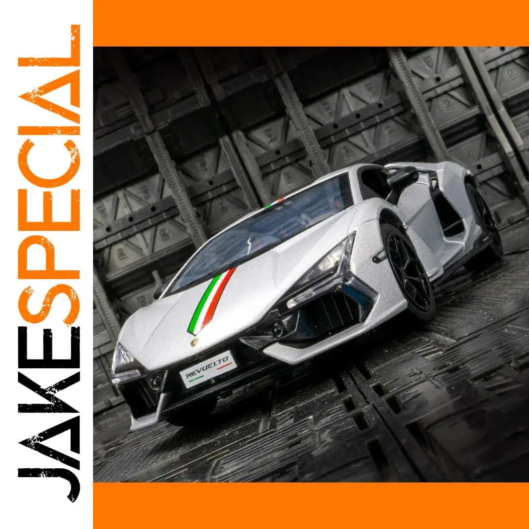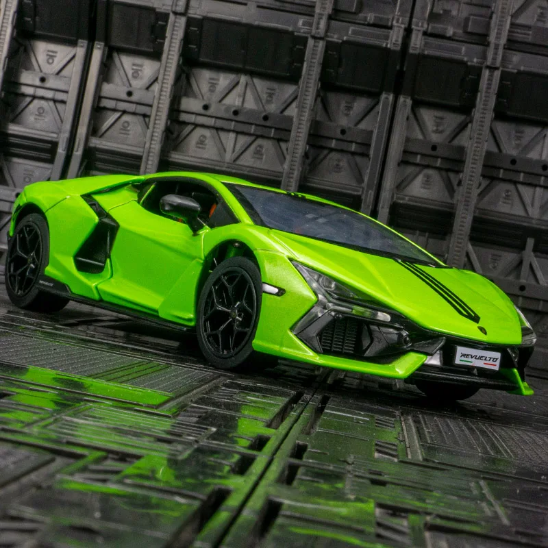 - Meticulously crafted 1:24 scale alloy model with detailed exterior and interior features that replicate the Lamborghini Revuelto's aggressive design and luxury craftsmanship.