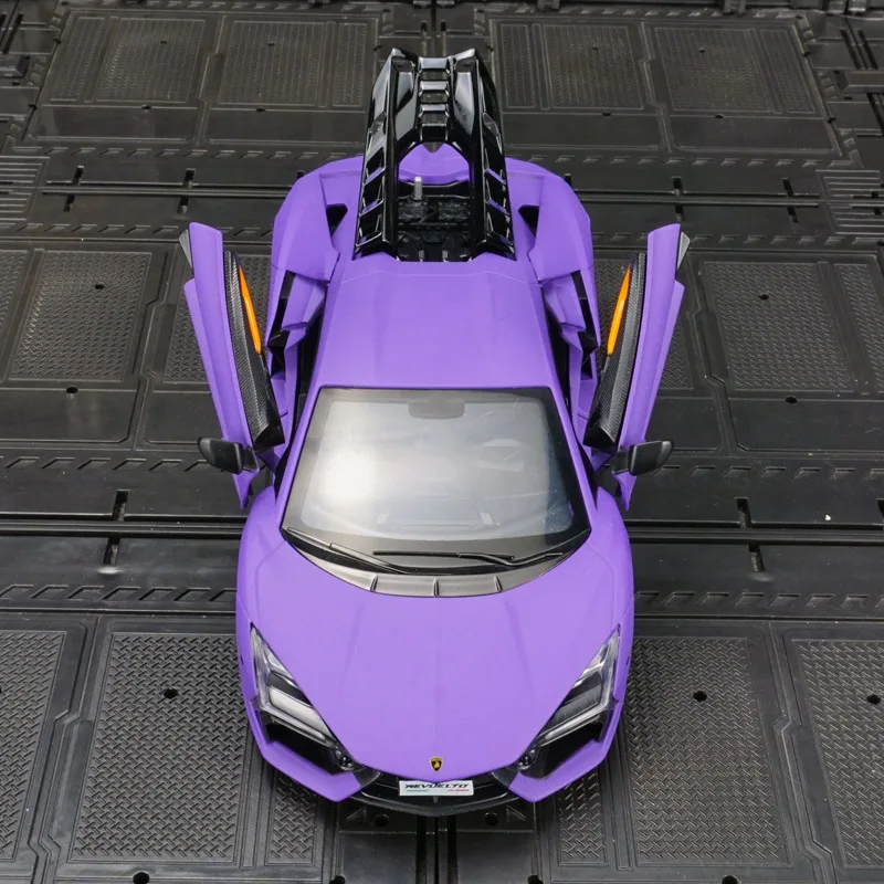 Experience the thrill of owning a highly detailed 1:24 scale diecast alloy model of the iconic Lamborghini Revuelto. Crafted with precision, this model captures the dynamic curves and sleek angles that define the original supercar. Its striking metallic finish is available in four eye-catching colors: silver, green, orange, and purple, allowing you to match your personal style. The aerodynamic body features sharp lines, air intakes, and distinctive headlights with LED-style lighting. Both doors open smoothly thanks to working hinges, revealing an intricately designed interior that mimics the real cabin. Equipped with simulated sound and functional lighting, this model provides an immersive, authentic experience. It’s perfect for passionate car enthusiasts and adult collectors alike.