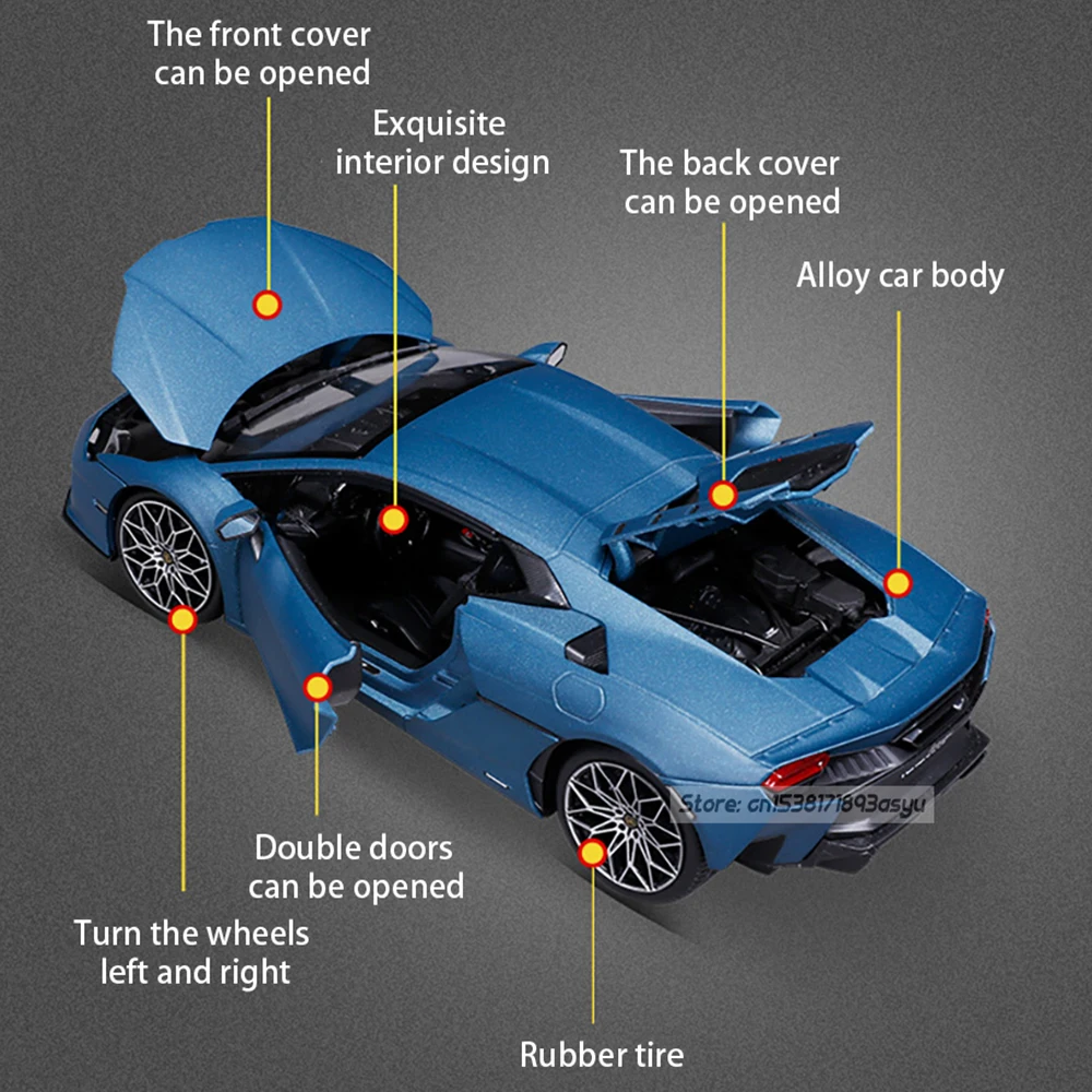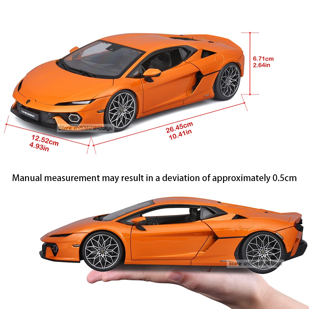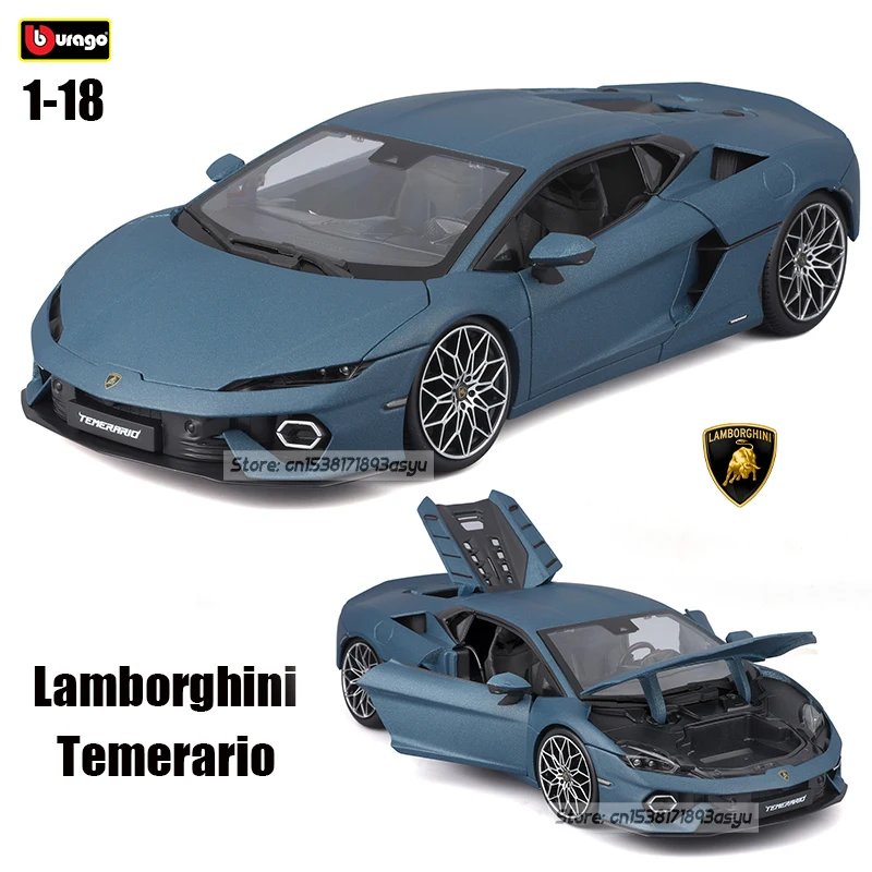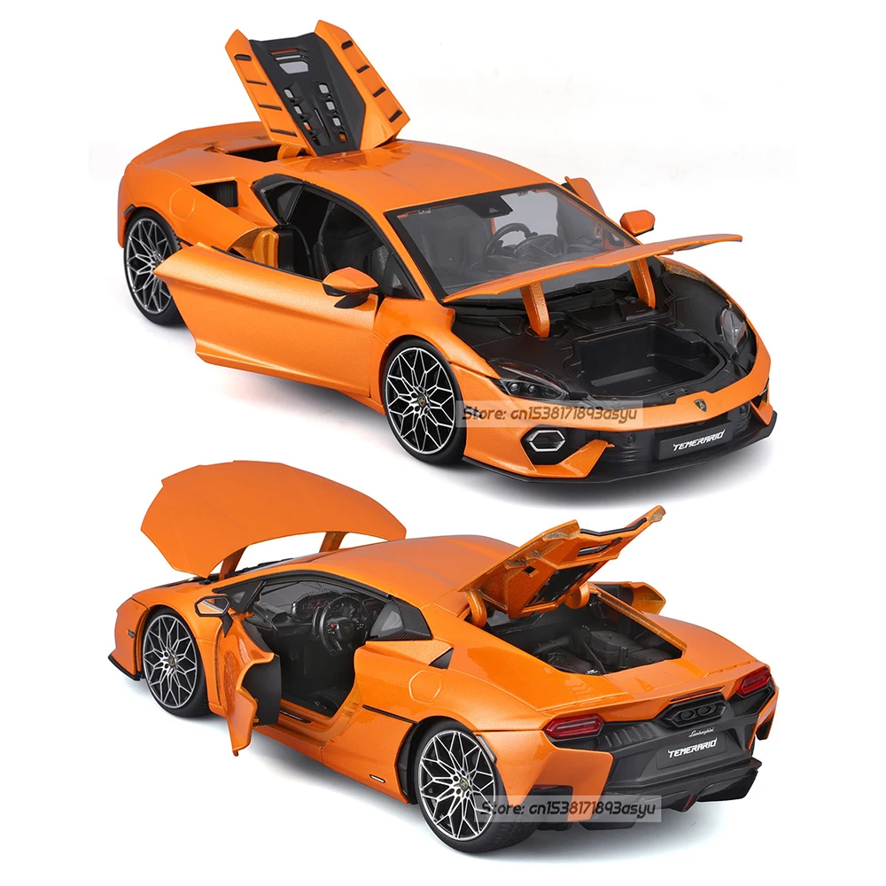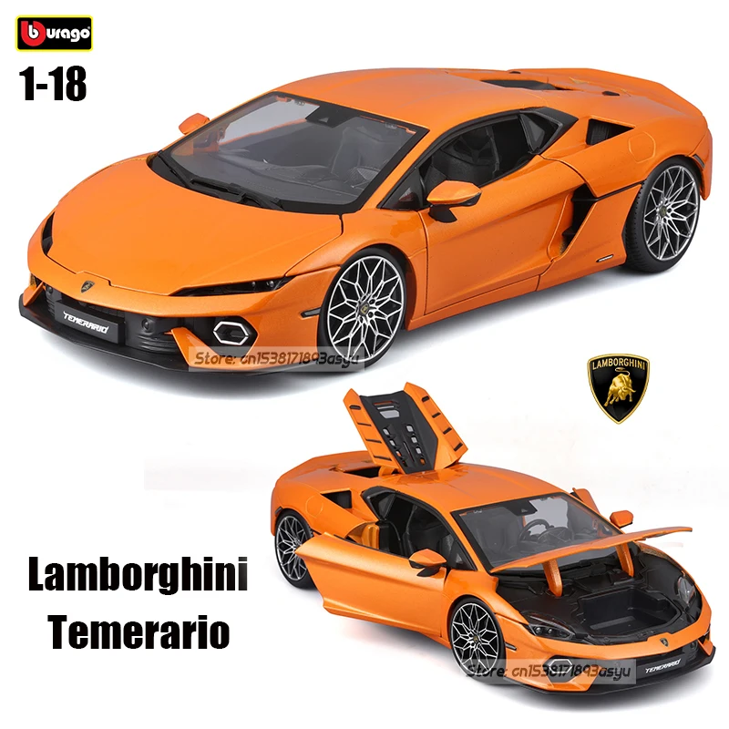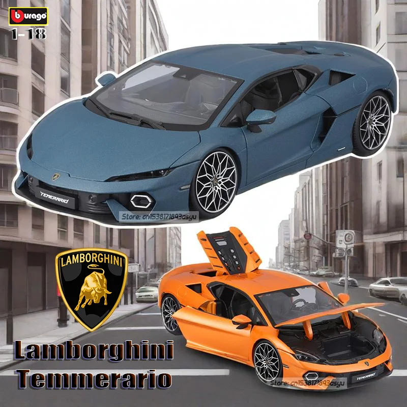 - This 1:18 scale Lamborghini Temerario model features a sleek, dark blue car with vibrant orange accents, capturing the sporty, modern look of the real racing car with precise aesthetic details.