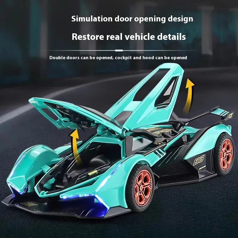Discover this beautifully crafted diecast model of the Lamborghini V12 Vision GT Gran Turismo supercar, scaled at 1:32. Made from durable metal, this detailed replica showcases a sleek, aerodynamic design with sharp lines and angular panels that Fans of high-performance cars will appreciate. The vibrant turquoise blue version features a highly polished, reflective surface that captures light beautifully, giving it a striking and realistic appearance. Black accents on the roof, sides, and rear wing enhance its sporty, aggressive presence. The model includes detailed small wheels with dark rims and textured tires, while the transparent roof and elongated windshield reveal intricate interior features. Perfect for display, this model offers a modern, energetic aesthetic that any collector will be proud to showcase.