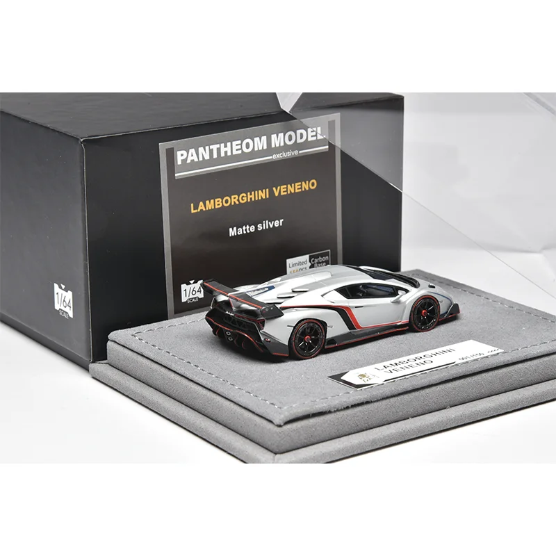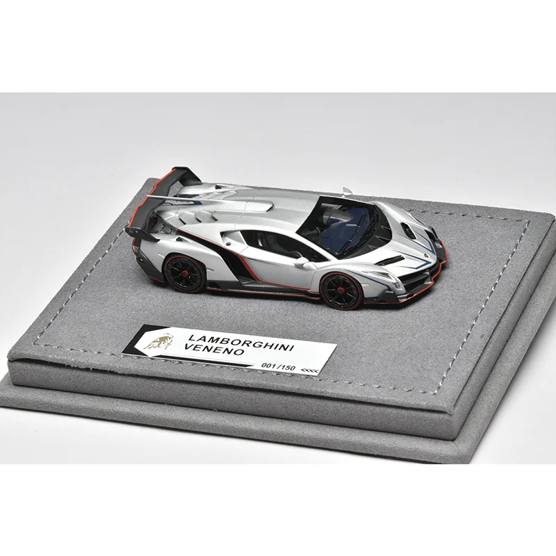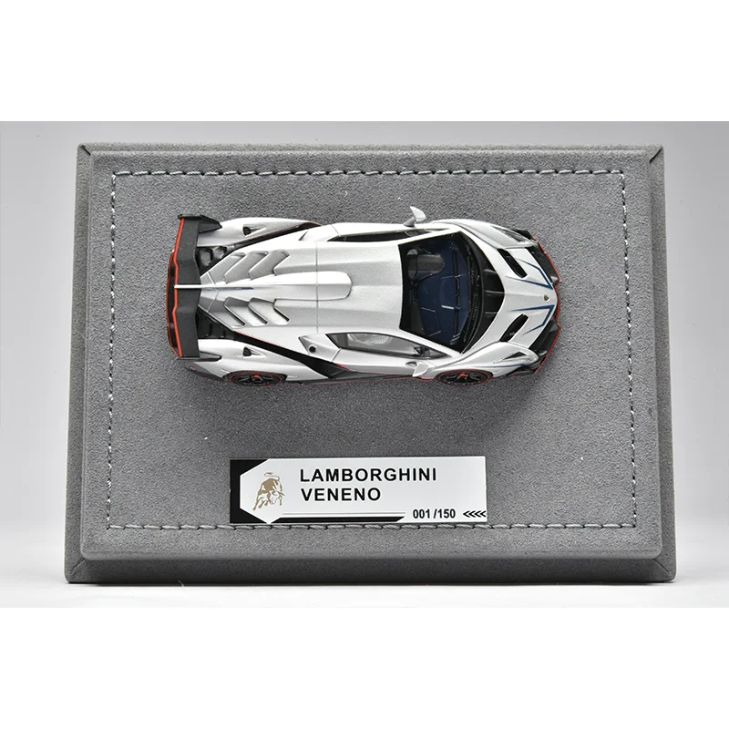 Experience the sleek, modern design of this miniature Lamborghini Veneno, crafted with exceptional detail and precision. Finished in luminous silver, it features sharp lines, aggressive stance, and aerodynamic curves that capture the essence of the original supercar. The model's smooth, streamlined body highlights intricate vents, sculpted doors, and a defined front grille, enhancing its lifelike appearance. Transparent windows reveal a finely detailed interior, including seats and dashboard to elevate realism. The black wheels with red accents add a striking sporty contrast, emphasizing high-performance aesthetics. Perfect for collectors, this model combines craftsmanship and style, offering a sophisticated display piece that celebrates revolutionary automotive design in a compact, collectible format. Ideal as a gift or display item, it vividly captures the luxurious and dynamic appeal of the Lamborghini Veneno.
