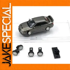 - Includes four interchangeable white-spoked wheels, black mounts, and a small black mounting piece, allowing customization and enhanced display options.