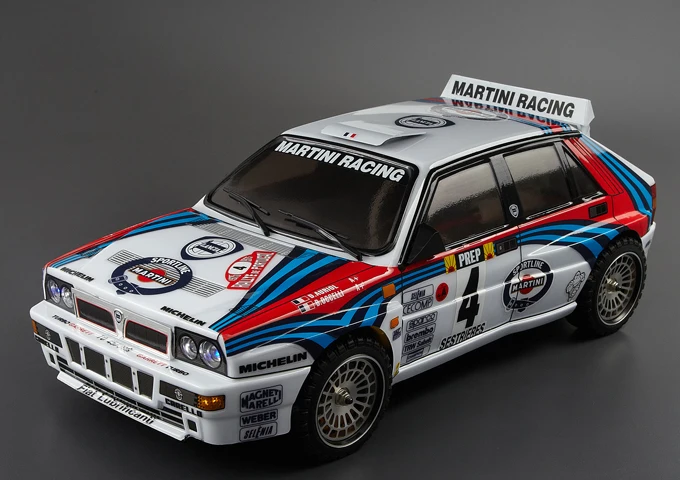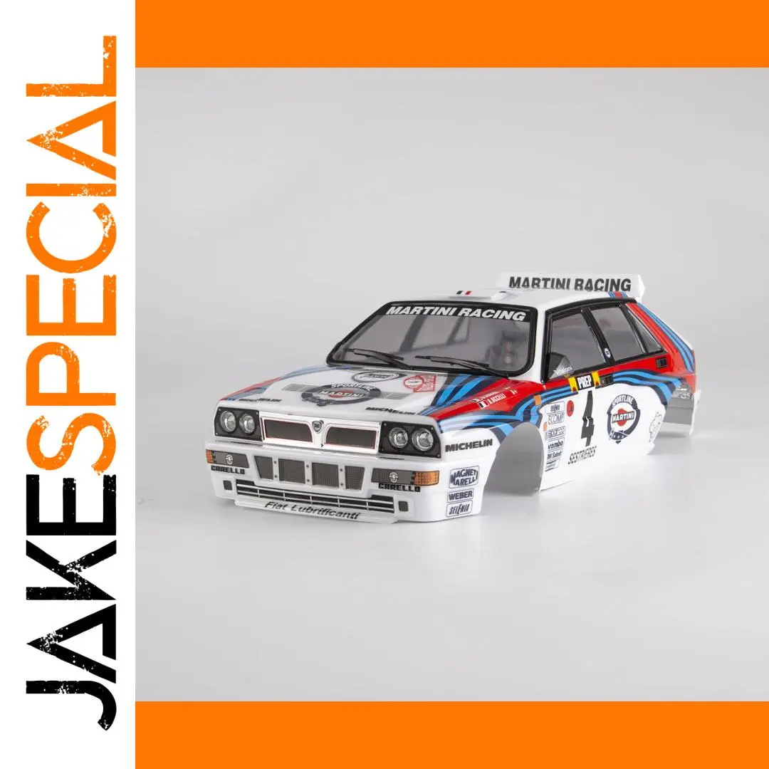Experience the thrill of racing with this precisely crafted Lancia Delta HF Integrale body shell, designed for 1/10 scale RC cars. Its striking Martini Racing livery features bold shades of deep blue, light blue, red, and white, capturing the essence of rally legend style. The aerodynamic design showcases sleek lines and detailed accents, including a front grille, air intake, side mirrors, and a prominent rear wing, all enhancing realism. Semi-transparent smoked windows and meticulously placed decals give it a high-performance look. Made from durable Japanese polycarbonate, this body shell offers exceptional clarity and strength. Whether you're customizing for competition or display, this sporty, vivid, and detailed shell promises to elevate your RC experience to the next level.