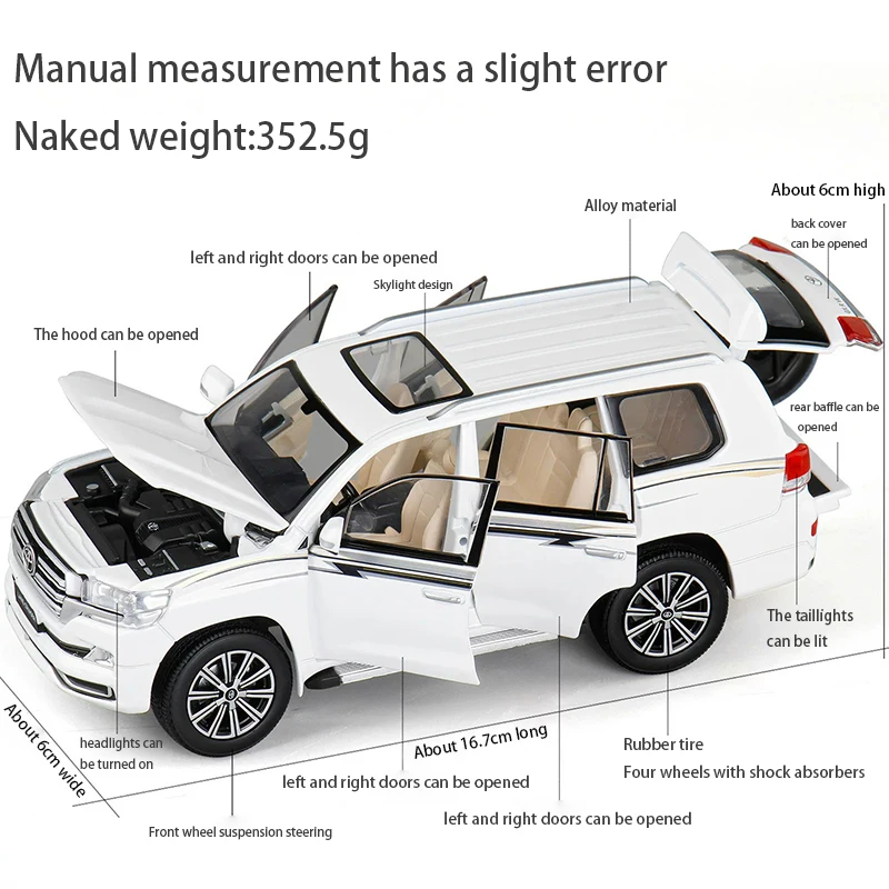 Imagine adding an element of realism and elegance to your collection with this meticulously crafted diecast alloy model of the Land Cruiser LC200. Designed at a 1:32 scale, it measures approximately 16.7 centimeters in length, 6 centimeters in width, and 6 centimeters in height. The pristine white finish highlights the vehicle’s sleek and robust SUV silhouette, accentuated by detailed features such as a prominent front grille with horizontal slats, sleek headlights, and intricately designed side mirrors. The transparent or tinted windows add a subtle gloss, while the finely detailed wheel rims replicate the real Land Cruiser’s design. Crafted for collectors and enthusiasts, this model exudes a high level of craftsmanship, making it an impressive display piece or gift for any automobile lover. Its limited edition status adds rarity and value, perfect for elevating your collection to a new level of sophistication.