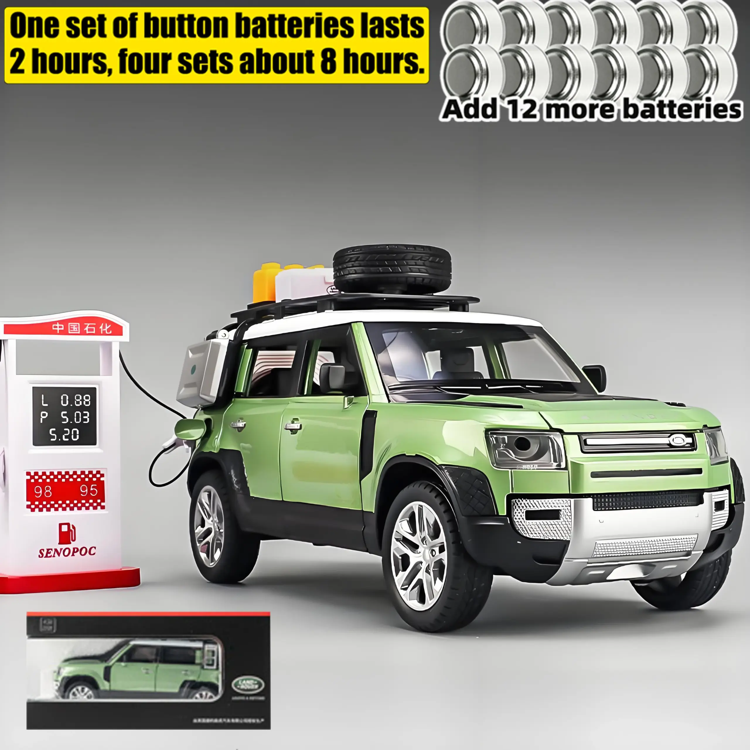 Experience the thrill of owning this highly detailed 1:24 scale diecast model of the iconic Land Rover Defender 110. Crafted from durable metal, this miniature off-road SUV boasts a sleek metallic blue finish, complemented by black accents and realistic multi-spoke silver rims. The model features transparent windows revealing an intricately designed interior with seats and a dashboard, while the front showcases a prominent grille, clear plastic headlights, and textured bumper details. Its rugged appearance is enhanced by details like panel lines, a matte black roof rack with secured accessories—including a spare tire, white container, and yellow fuel cans—each detailed with decals. Perfect for indoor decoration or display, this collectible exudes authenticity and craftsmanship.