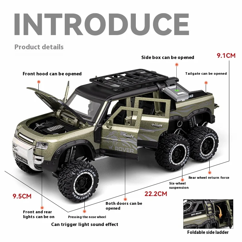 Experience the ultimate off-road adventure with this highly detailed 1:24 scale Land Rover Defender 6×6 diecast model. Crafted from durable alloy metal, it offers a realistic weight that enhances its authentic feel and display appeal. The model’s matte black finish emphasizes a rugged, industrial aesthetic, complemented by prominent wheel arches and black fender flares that evoke strength and durability. Six large off-road tires with deep treads, mounted on black alloy-style rims with white lettering like “LIGHTWEIGHT” and “GOODYEAR,” provide exceptional traction. Decorated with a lion emblem labeled “ROVER,” white and gray stripes, and labels like “OFF-ROAD,” it vividly portrays adventure. Additional realistic features include a functional roof rack with a white container, tail lights, rear bumper, and a license plate area. The model is equipped with light and sound effects operated by a switch, making it perfect for display or imaginative play, and is available in black, green, and white to suit your collection style.