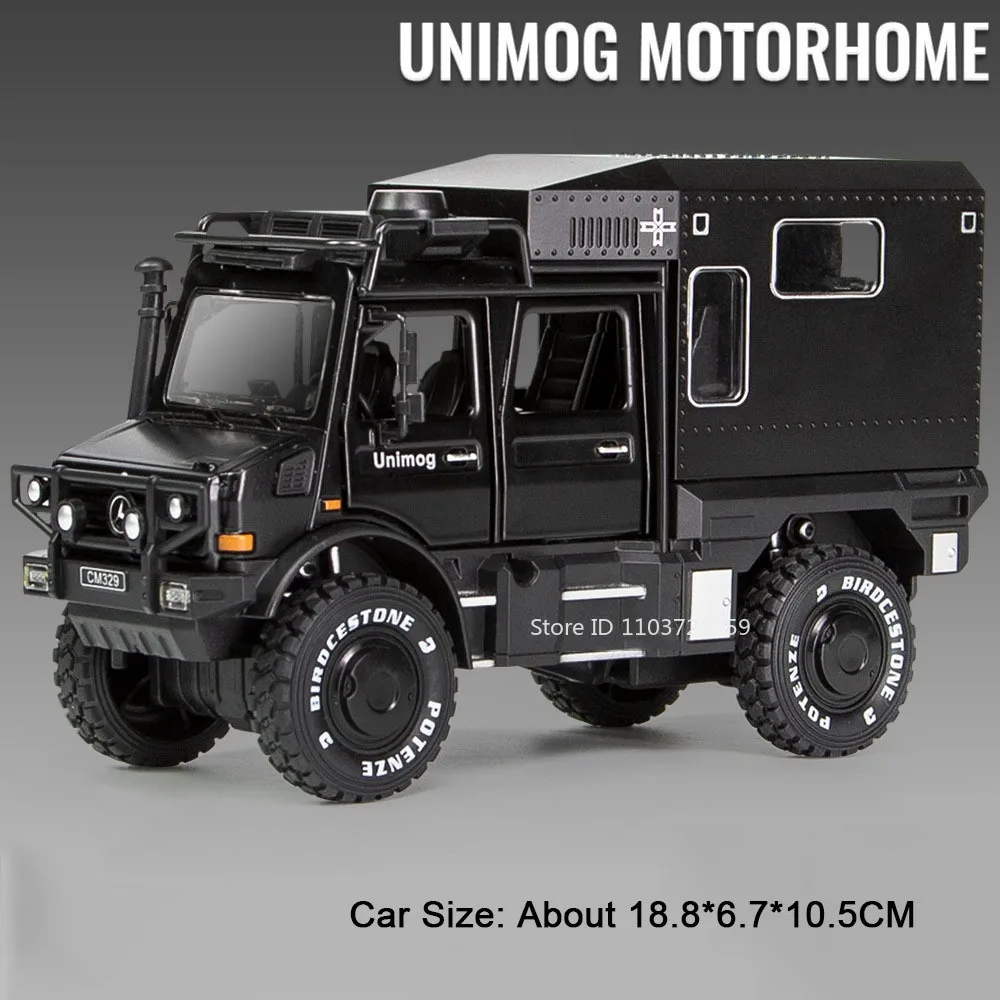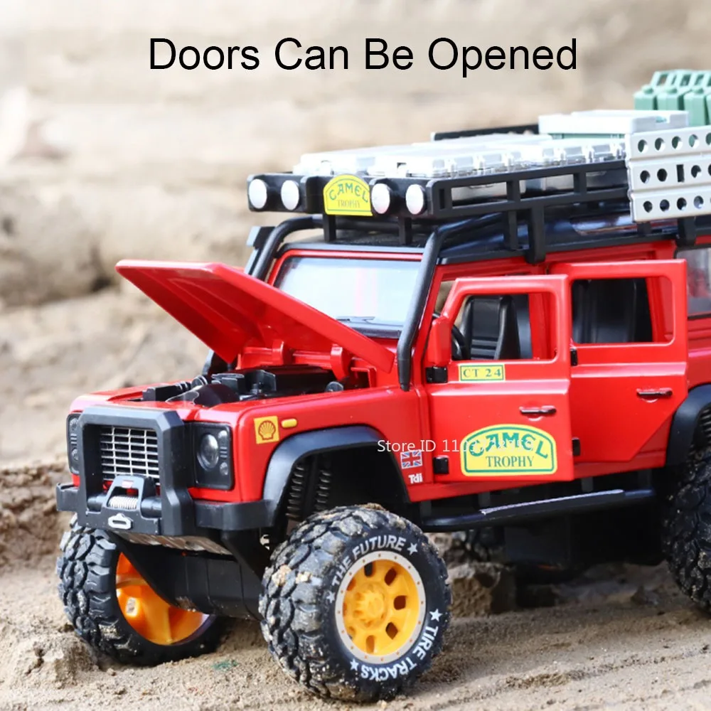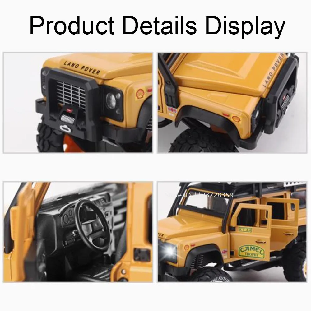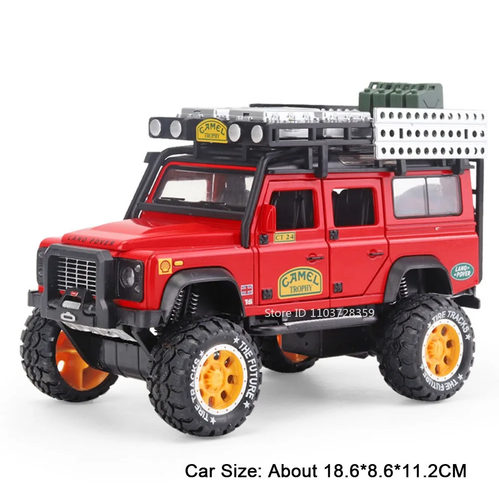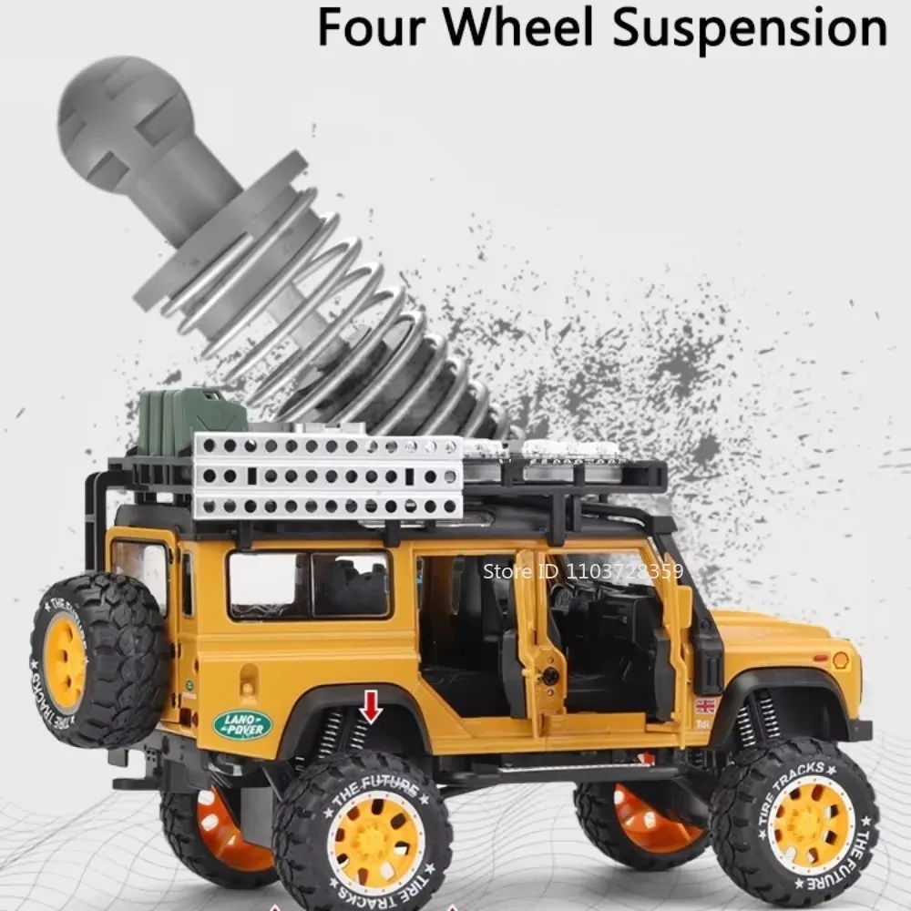 Experience the thrill of off-road adventures with this high-simulation 1:28 scale diecast model showcasing a Land Rover Defender or UNIMOG RV vehicle. Crafted with a durable metal alloy body, plastic chassis, and rubber tires, these detailed models measure approximately 18.6 x 8.6 x 11.2 cm for the Defender and 18.5 x 7 x 10.5 cm for the UNIMOG. Featuring vibrant colors like yellow, red, green, black, and police variants, they include opening doors, engine hood, and trunk for added realism. Activated by pressing the body, they come to life with sound and light effects, pull-back motion, shock absorption for rugged terrain, and built to withstand falls and collisions, making them perfect for collectors and enthusiasts 14 and above.