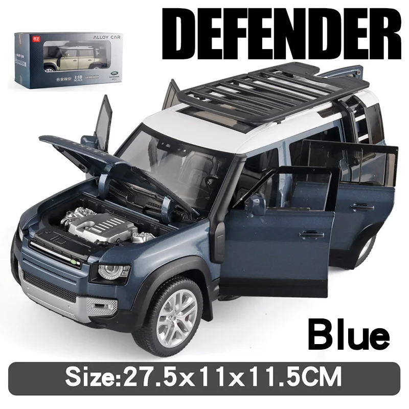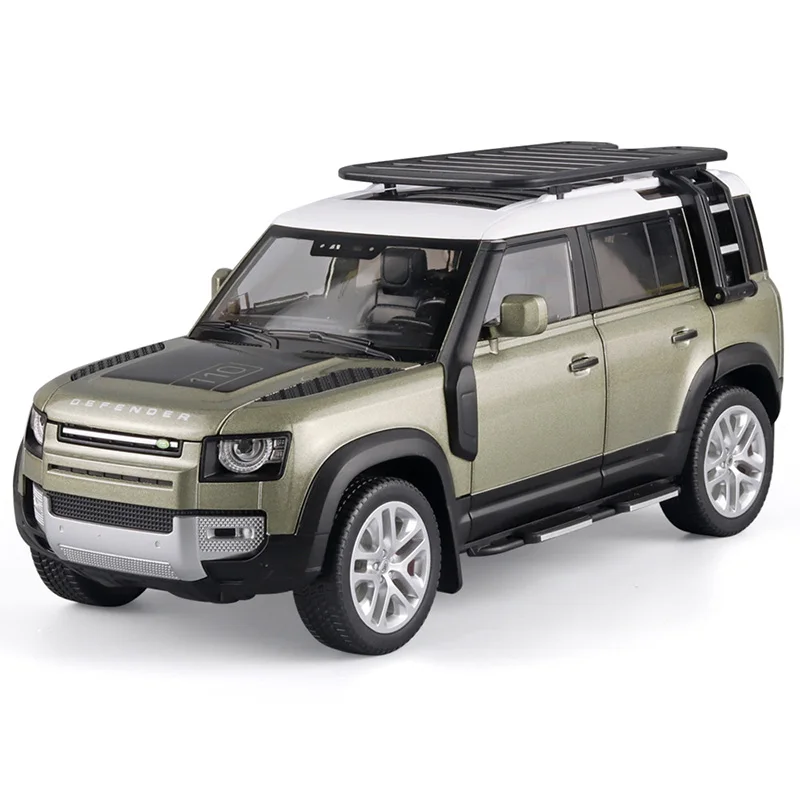 Step into the world of rugged sophistication with this detailed 1/18 scale Land Rover Defender Range Rover SUV model. Crafted from high-quality metal and plastic, its sleek alloy body is finished in a shiny black hue, complemented by available colors like white, blue, or green. This model masterfully captures the vehicle’s signature grille, clear lens headlights with inner detailing, and the raised central hood with molded vents. Featuring functional doors that open, a roof cargo rack, and multi-spoked alloy wheels with realistic tires, it exudes an authentic off-road vibe. The suspension system includes four-wheel shock absorbers and front wheel steering, offering dynamic playability. Powered by non-rechargeable mechanisms, it also boasts sound and light features, ideal for collectors and enthusiasts alike.