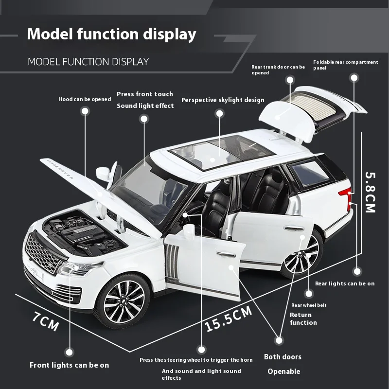 Bring home the detailed 1:32 scale diecast model of the Land Rover Range Rover 50th Anniversary Off-Road SUV, crafted from durable metal with a realistic non-electric design. This collectible features a sleek white finish with smooth contours, a honeycomb-patterned grille with metallic accents, streamlined headlights with transparent lenses, and alloy-style wheels with textured tires. Available in black, black box, white, and white box, this model is perfect for desktop decorating or as a sophisticated gift for adult collectors. Its precise craftsmanship captures the iconic SUV’s refined shape, making it a must-have for enthusiasts seeking high-quality and true-to-life detailing.